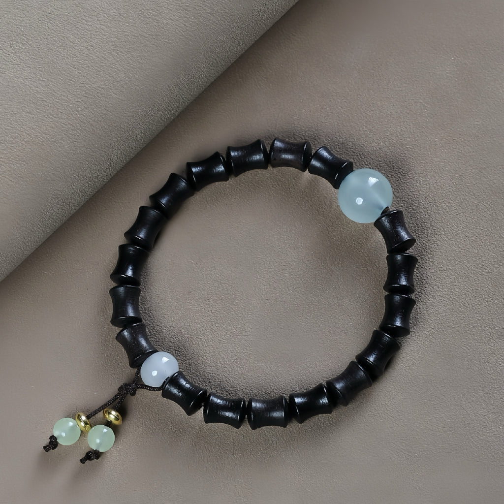 Crafted with 18 polished black sandalwood beads (6mm) in a sleek bamboo-joint design, this bracelet exudes earthy sophistication. Accented with luminous jade pearls—a larger sky-blue stone and two smaller mint-green stones—set alongside golden spacers and delicate black beads, the pendant adds a touch of celestial calm. The stark contrast between the deep sandalwood and soft jade hues creates a striking visual balance, mirroring the harmony of night and light.