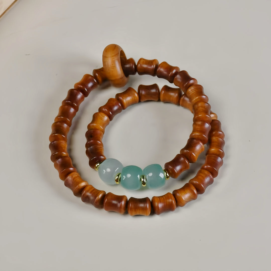 Hand-strung with rich, reddish-brown cliff cypress wood beads—revered for their purifying warmth and connection to nature—the bracelet features three luminous green agate stones (often associated with calm and emotional healing), each separated by delicate golden spacer beads symbolizing prosperity and flow.