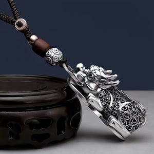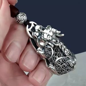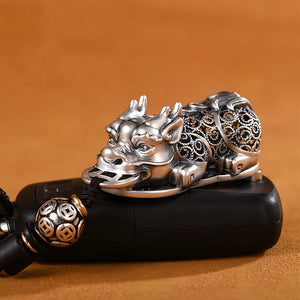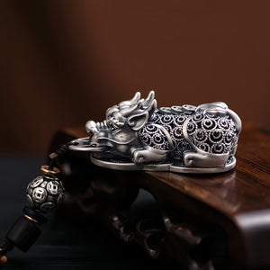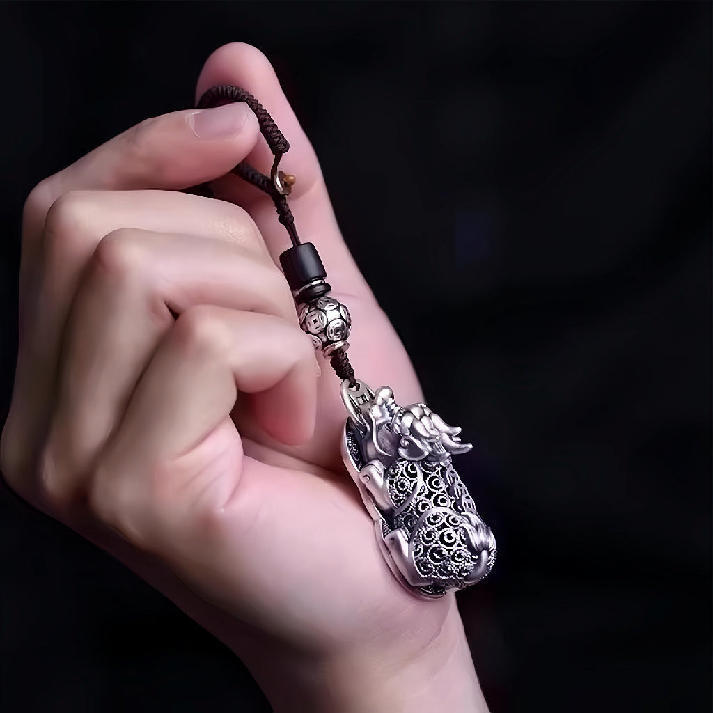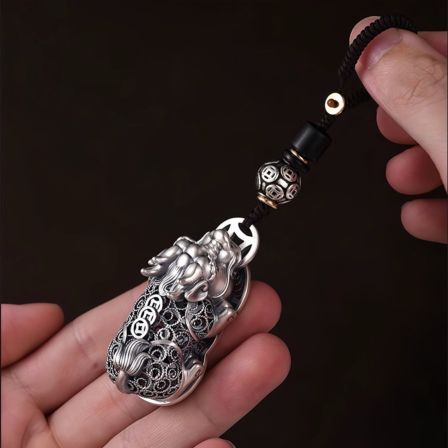 This intricately designed keychain features the mythical Pixiu (貔貅), a powerful and auspicious creature in Chinese mythology. Pixiu is a celestial guardian renowned for its insatiable appetite for wealth and its unique ability to swallow treasure without expelling it. This makes it a potent symbol of prosperity and good fortune. The hollow-carved design showcases exquisite craftsmanship, while also representing the idea of an open vessel to attract and hold onto wealth. The intricate details of this silver charm serve as a constant reminder of its powerful protective and wealth-attracting qualities.