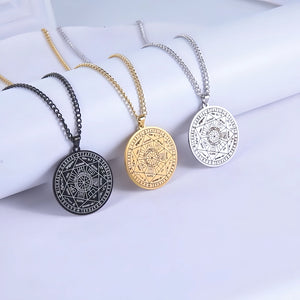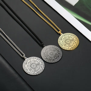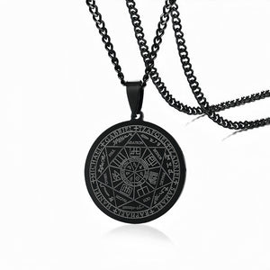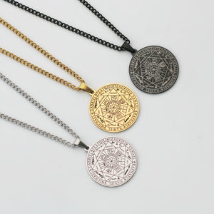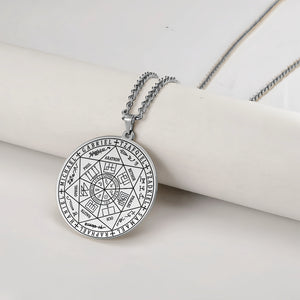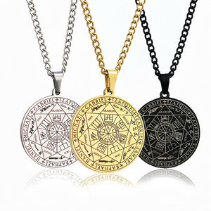 Este colgante lleva grabados los sigilos de los Siete Arcángeles: un mapa compacto y portátil de tutela espiritual. Cada arcángel representa tradicionalmente una cualidad a la que puedes recurrir en tu vida diaria: