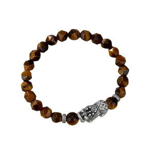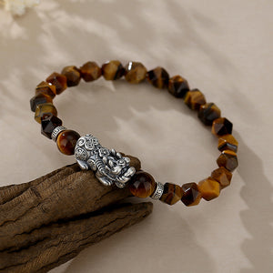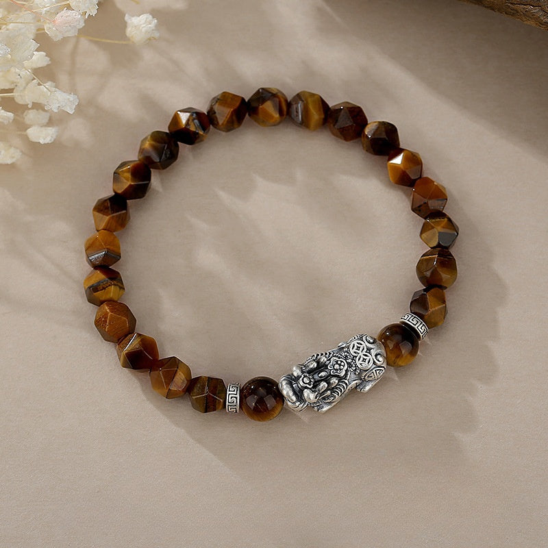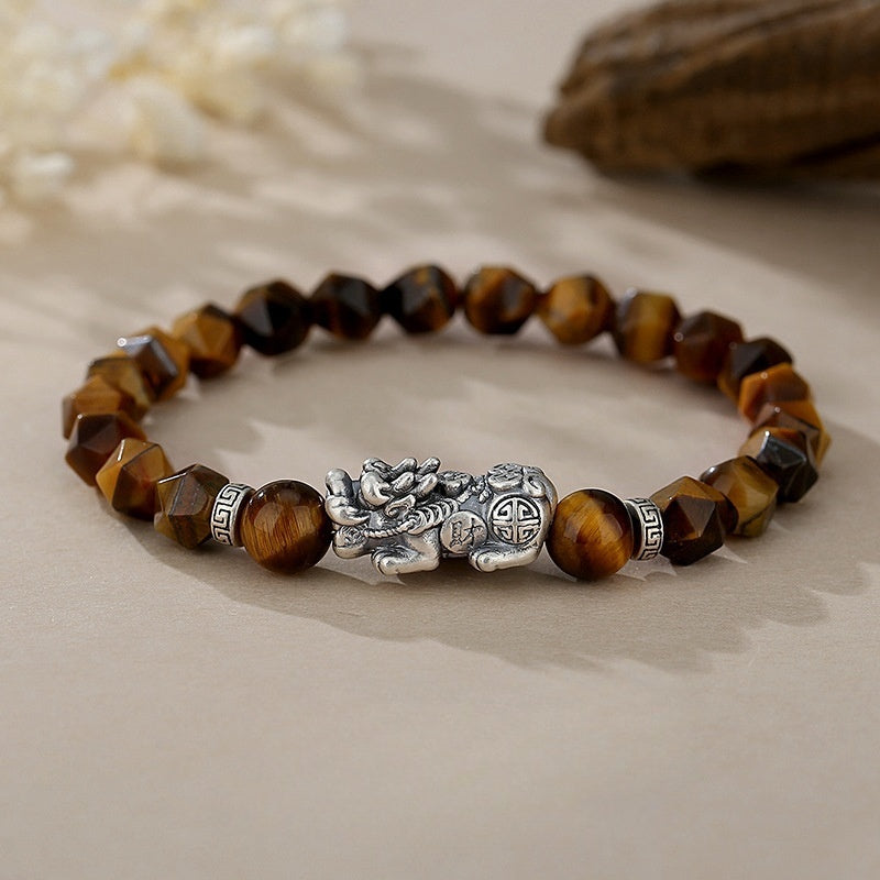Tallada a partir de los susurros fundidos de la tierra, la pulsera guardiana de la riqueza con ojo de tigre facetado Feng Shui Pixiu de plata tailandesa 999 es un vórtice talismánico de poder.