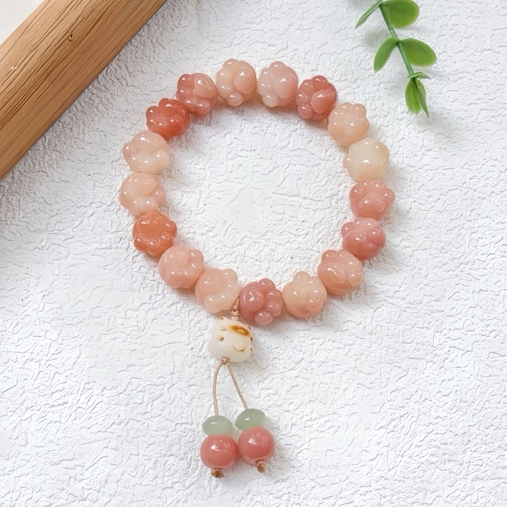 Esta pulsera, ensartada a mano con cuentas Bodhi en tonos rosa degradado, talladas en adorables formas de garras de gato —que van desde un suave rubor hasta un rosa vibrante—, irradia energía juvenil y una espiritualidad apacible. Un colgante de cerámica blanca con una cara de gato, con una expresión dulce y minimalista, cuelga debajo, flanqueado por dos pequeñas cuentas en rosa y verde, creando un delicado detalle tipo borla.