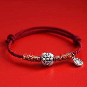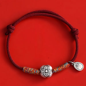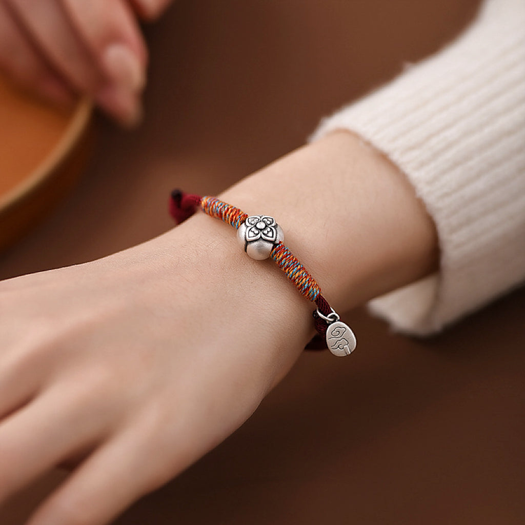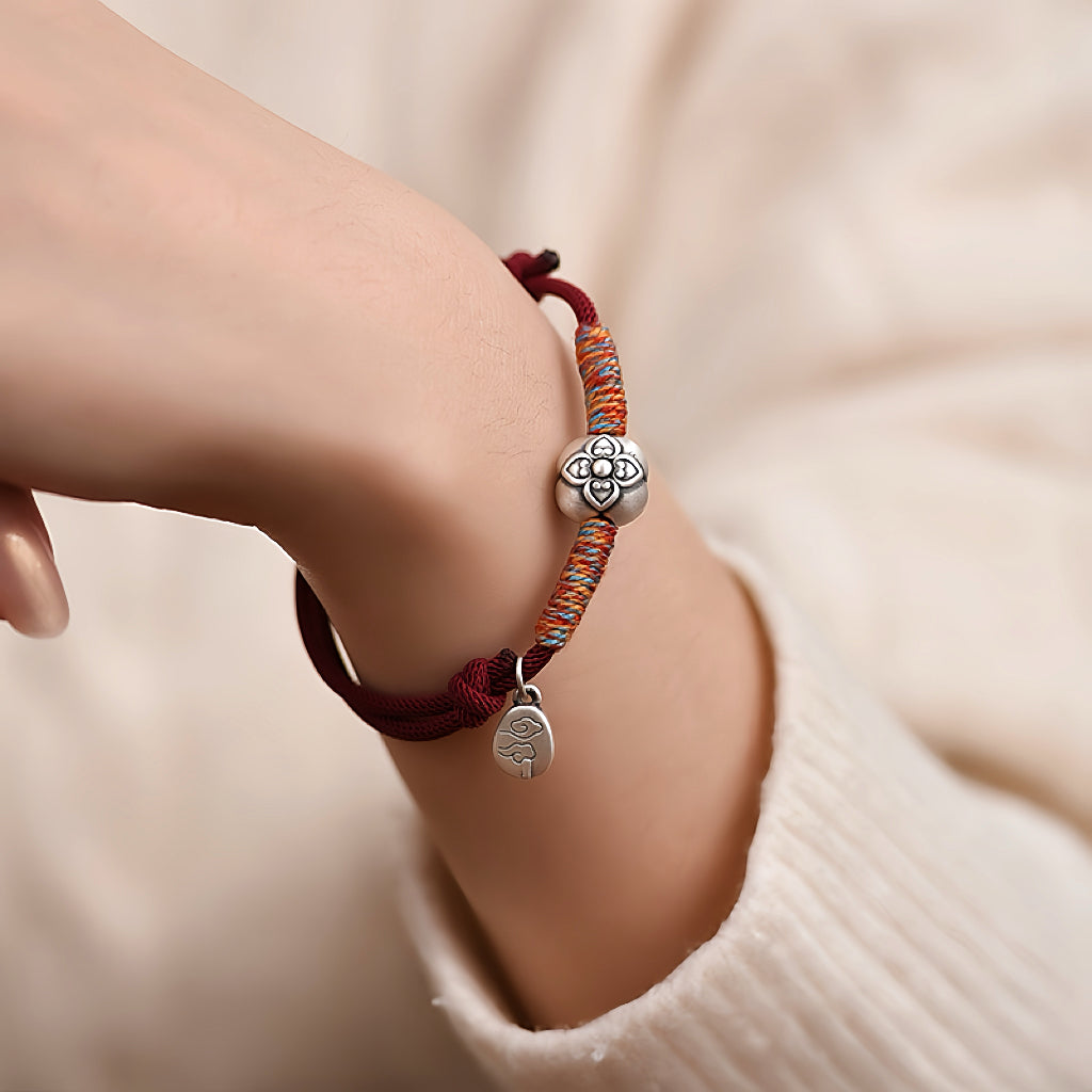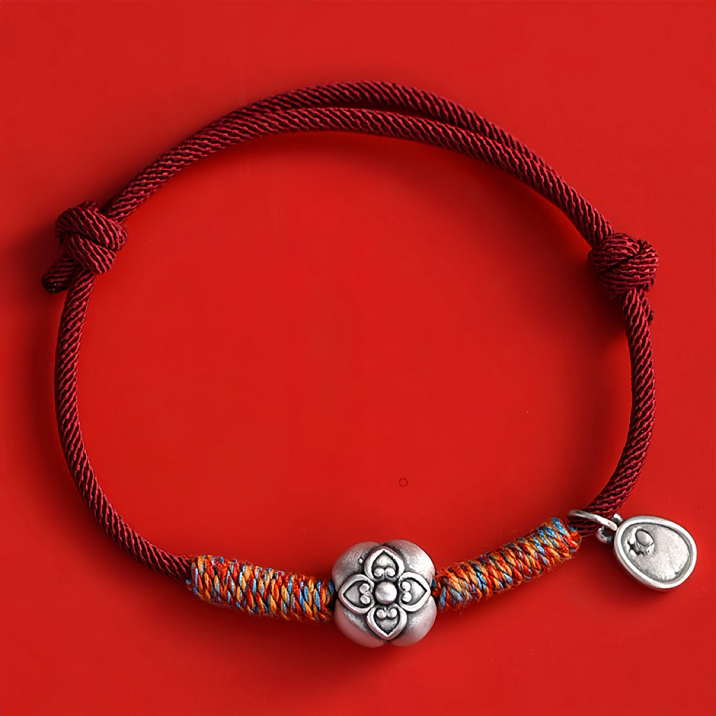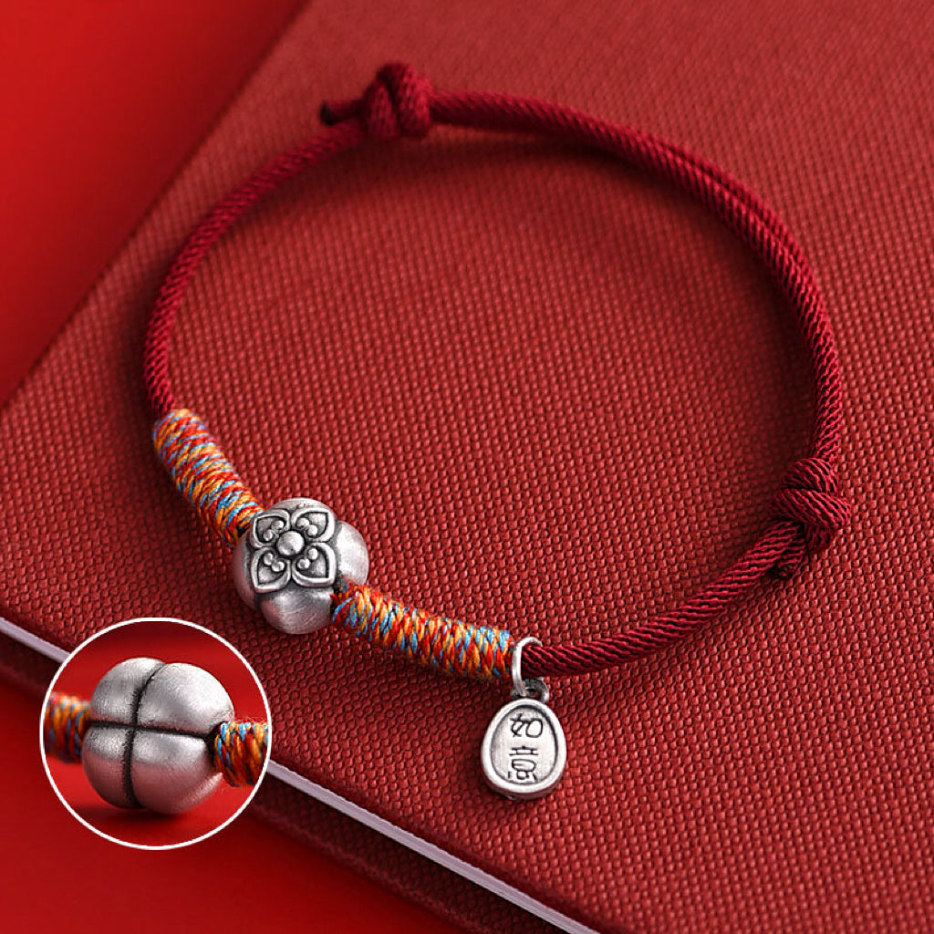 El diseño se centra en dos significativos dijes de plata: una flor de caqui delicadamente elaborada (que simboliza la promesa de prosperidad) y un colgante con un pergamino Ruyi, un antiguo icono del este asiático que representa "la vida que se despliega como se desea". Entre ellos, vibrantes hilos carmesí y dorados aportan una energía festiva, mientras que la frase "柿柿如意" (Shì Shì Rú Yì) susurra su bendición: "Que todo salga bien como tu corazón desea".