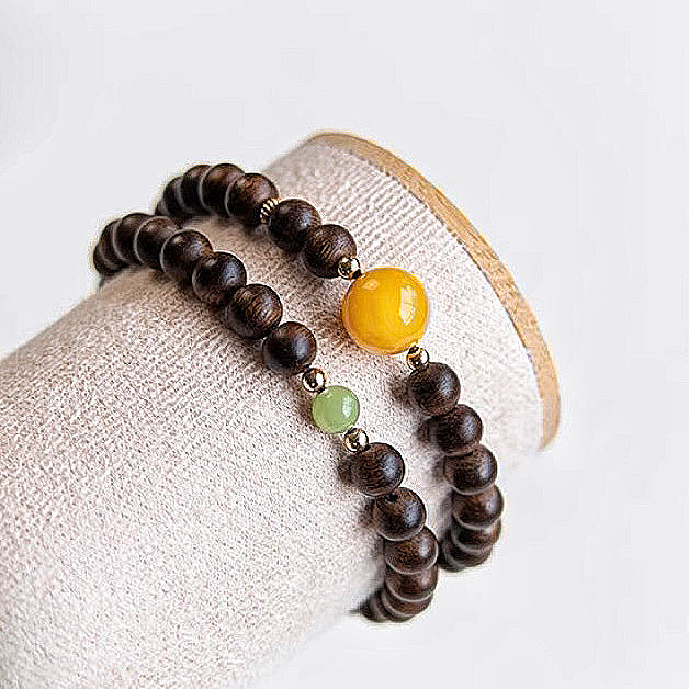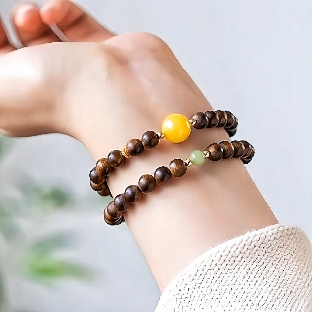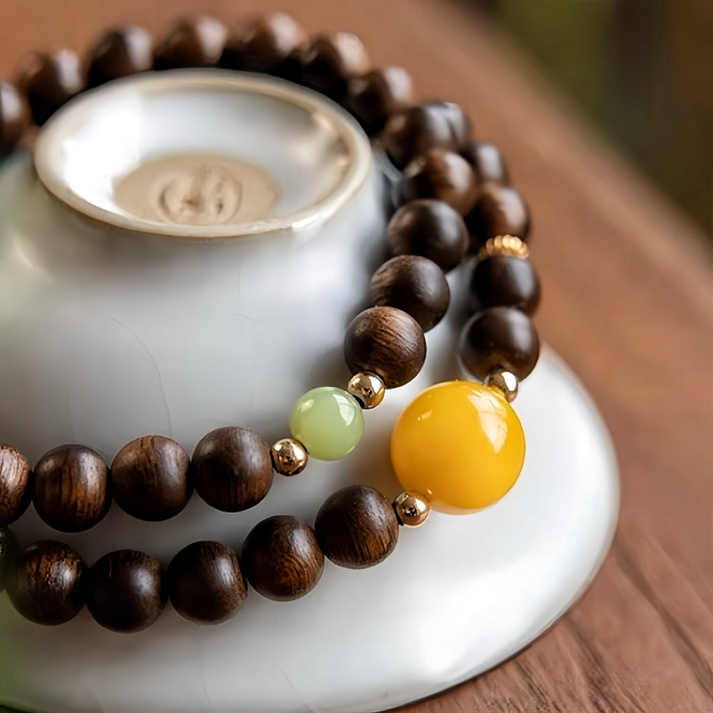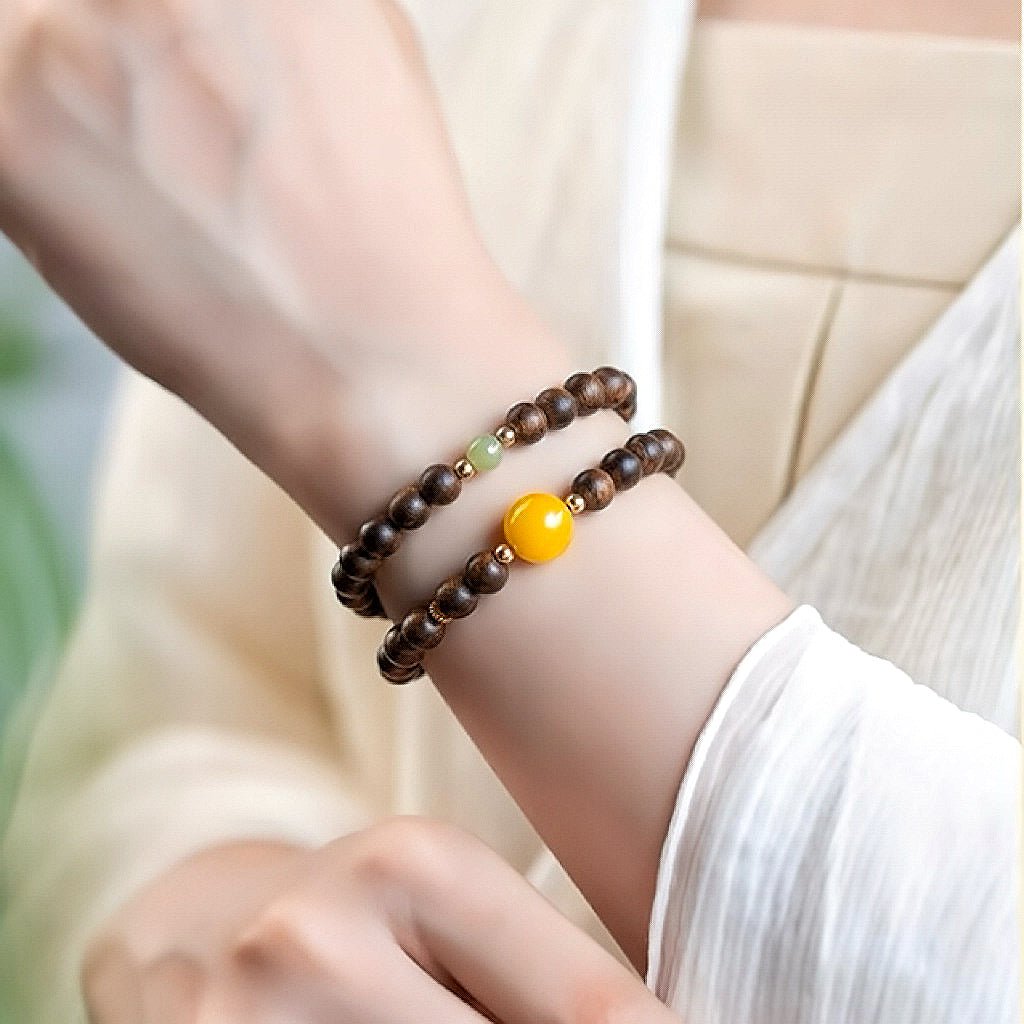 La pulsera está elaborada con cuentas de madera de agar genuina, con acentos de jade natural y ámbar.