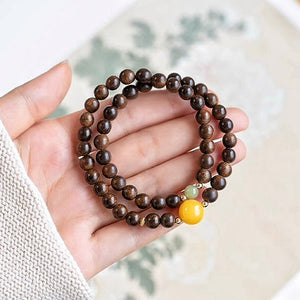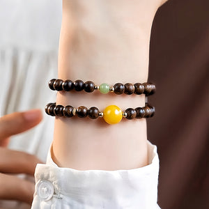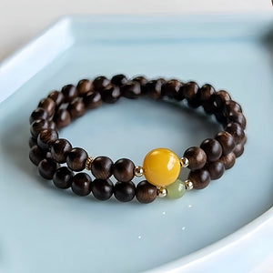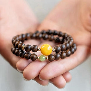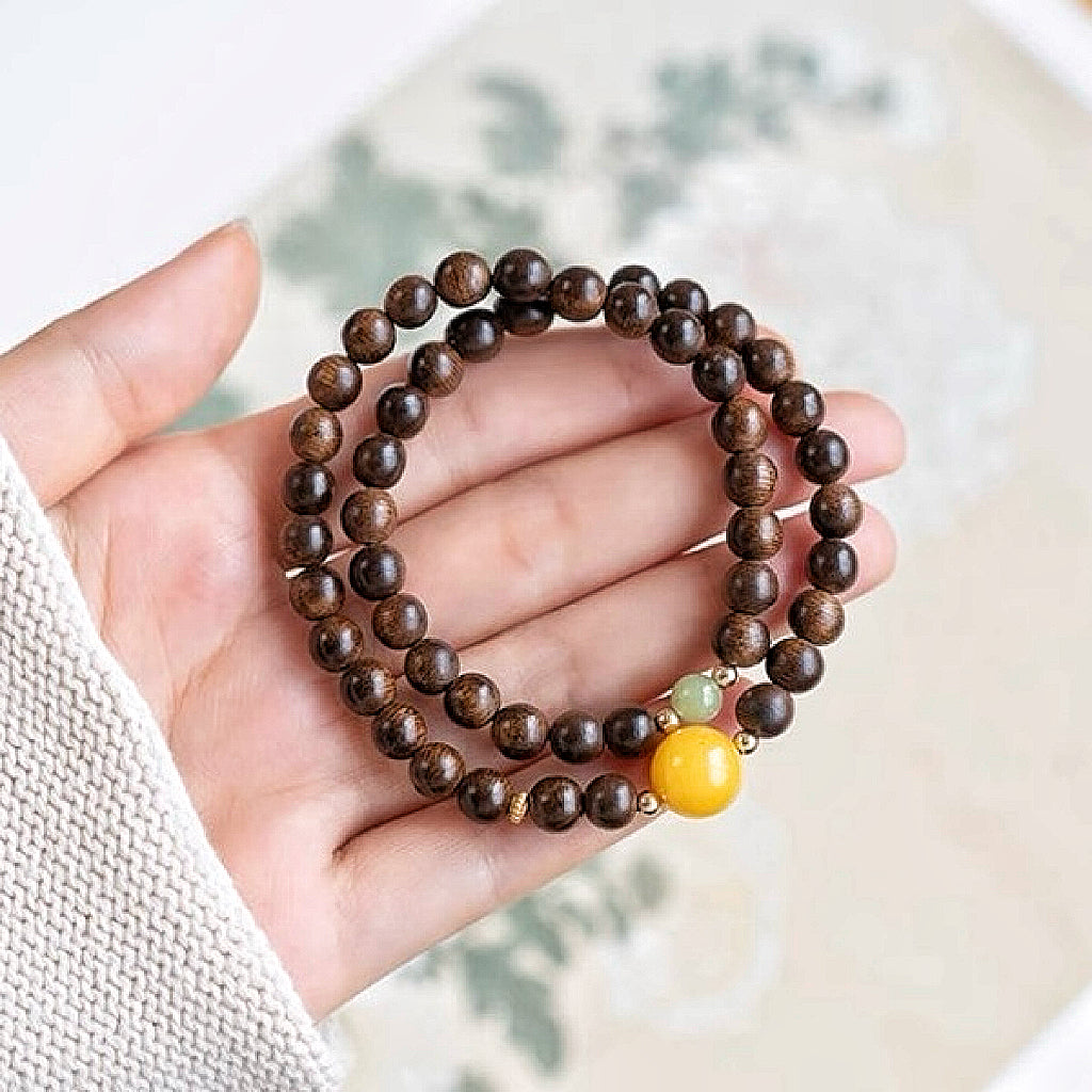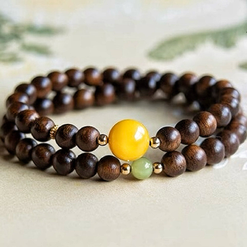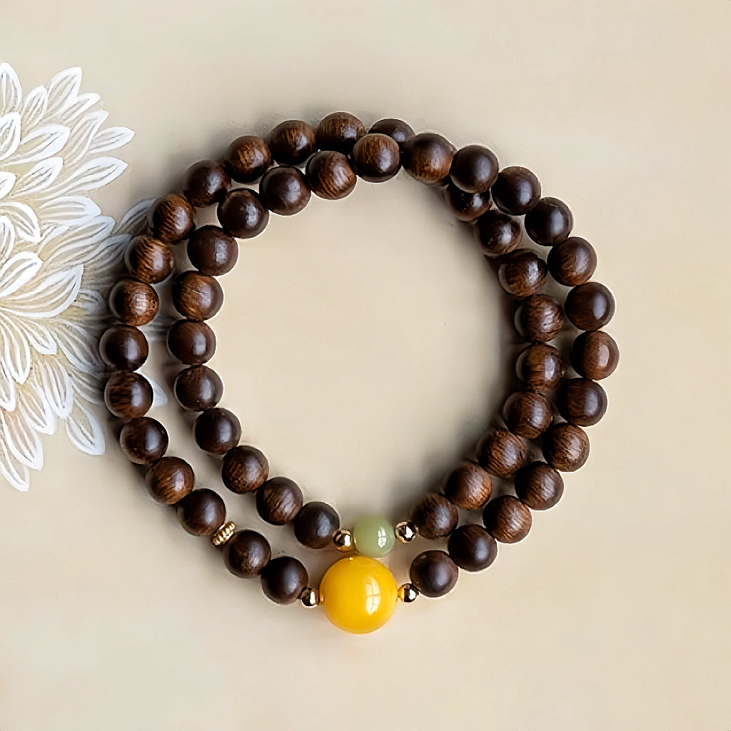 La pulsera está elaborada con cuentas de madera de agar genuina, con acentos de jade natural y ámbar.