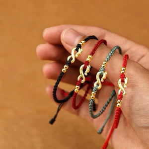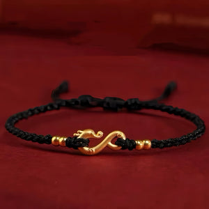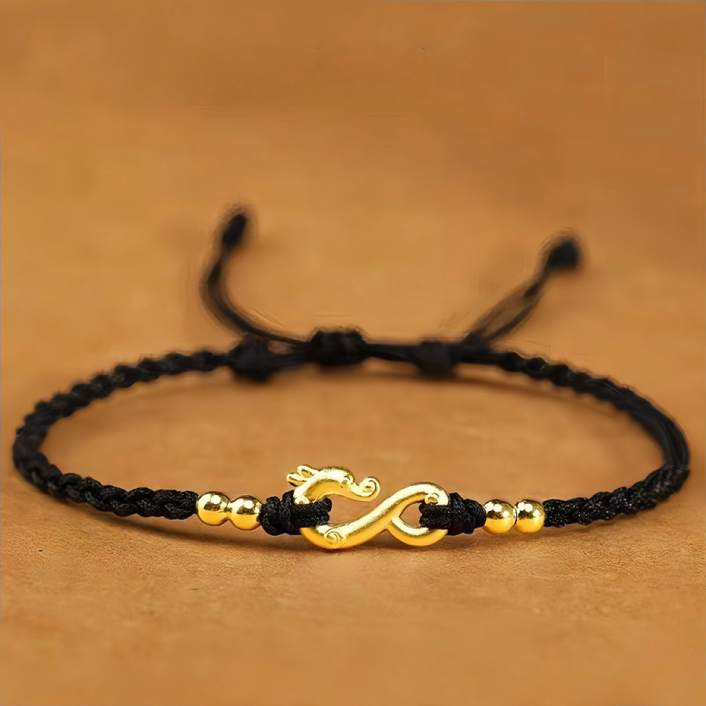 En su centro se alza un dije de dragón dorado, meticulosamente esculpido, suspendido en pleno movimiento, como en la tradición oriental, donde los dragones simbolizan el poder benévolo, la sabiduría y el dominio cósmico. Dos cuentas de oro pulido flanquean al dragón, simbolizando el dominio de la dualidad (acción/intuición, ambición/equilibrio), mientras que los nudos corredizos negros garantizan un ajuste seguro y ajustable.