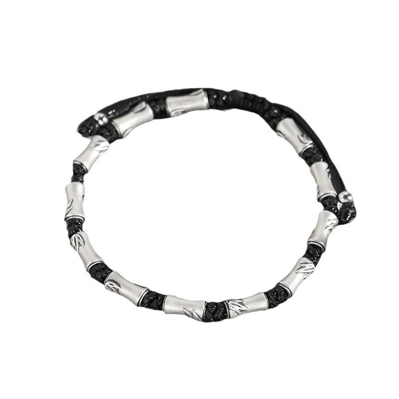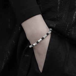 Cada segmento de bambú, fundido en luminosa plata 999, evoca resiliencia: hueco pero irrompible, se dobla pero nunca se fractura bajo el peso del destino. Las cuentas de ónix, pulidas a la medianoche, anclan las energías errantes, transformando el caos en una quietud fértil.