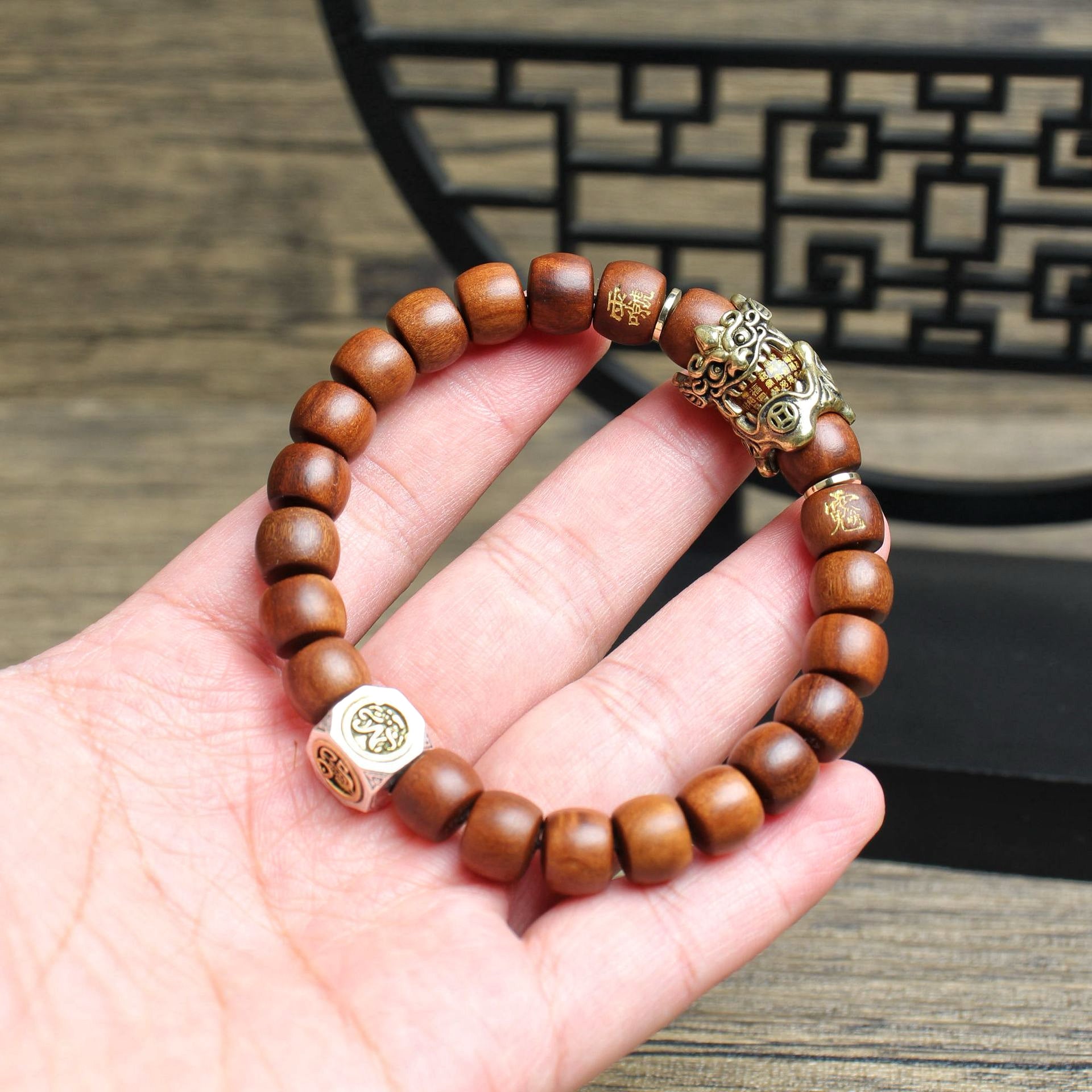 Ensartadas a mano con cuentas de madera de azufaifo pulida en ricos tonos caramelo, sus superficies lisas revelan texturas naturales de veta de madera que evocan calidez orgánica y energía arraigada. En su centro se encuentra una criatura mítica Pixiu, meticulosamente fundida en metal con detalles dorados, cuya postura feroz simboliza la atracción de la riqueza y la repulsión de la desgracia. Dos cuentas de madera grabadas con antiguos caracteres de escritura de sellos y una cuenta cuadrada de metal adornada con intrincados motivos de nubes y truenos añaden capas de profundidad simbólica, evocando la mística de la antigüedad china.
