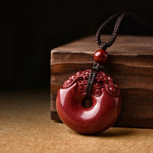 - Material sagrado: Se cree que el cinabrio, apreciado en el Feng Shui, disipa la negatividad y atrae la tranquilidad, mientras que la ficha circular representa la paz eterna.