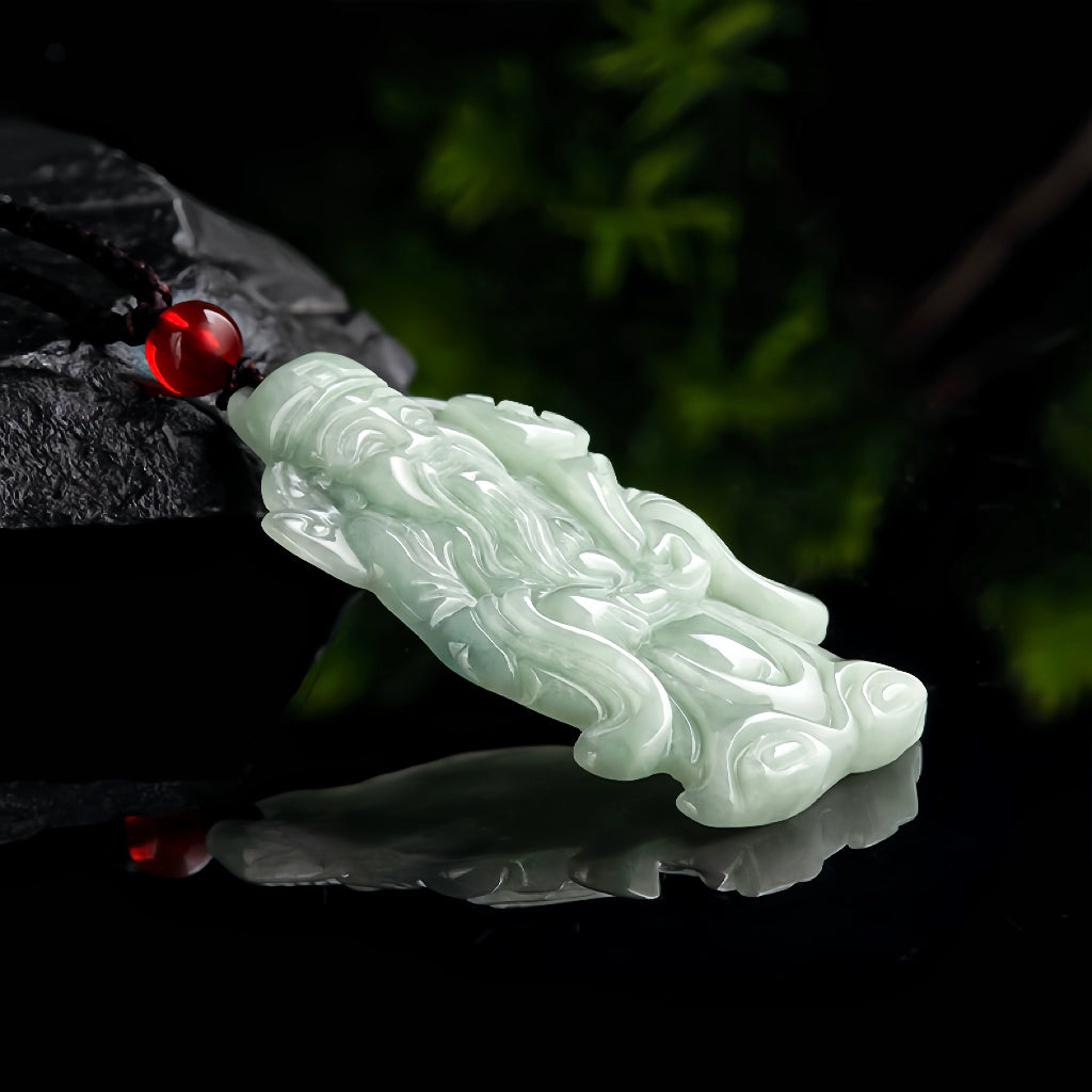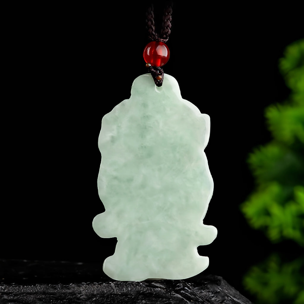 Da la bienvenida a una vida de abundancia, prosperidad y bendiciones divinas con este exquisito colgante del Dios de la Riqueza, tallado a mano. Esta obra de arte, elaborada a partir de una sola pieza de jadeíta natural de alta densidad, encarna a una de las figuras más veneradas de la cultura oriental.