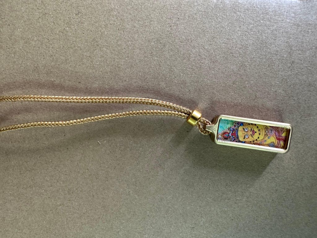 Lleva contigo una auténtica pieza de arte sagrado del Himalaya y las bendiciones de un poderoso protector, dondequiera que vayas. Este exquisito colgante no es una reproducción; es un santuario portátil, un verdadero Thangka en miniatura, pintado a mano individualmente por un artista experto y enmarcado en latón.