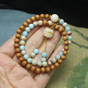 Adorna tu muñeca con el delicado encanto y la esencia relajante de la pulsera Kitty Charm de sándalo indio Babi. Esta encantadora pulsera de dos vueltas combina el cálido y ligero aroma de las cuentas de sándalo indio Babi con toques de un azul sereno y cuentas de jaspe con sutiles dibujos.