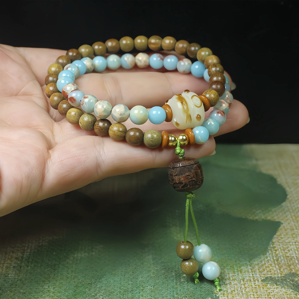 - Fomentar la serenidad y la conexión a tierra: La inclusión de cuentas azules y estampadas similares al jaspe agrega un toque de color e interés visual; el jaspe a menudo se asocia con energías de conexión a tierra y nutrición.