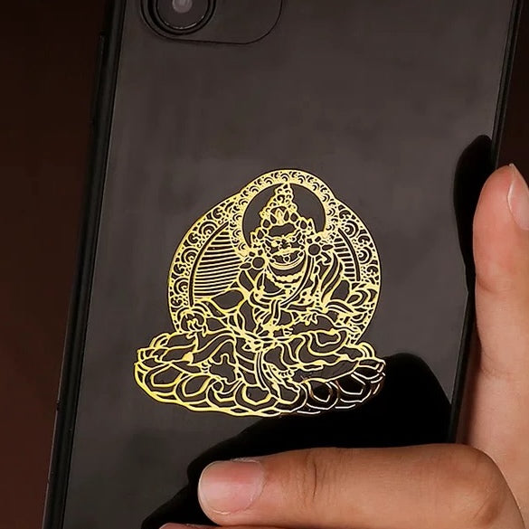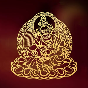 This sacred image depicts Yellow Jambhala, the chief of the Five Wealth Gods in Tibetan Buddhism. He is a powerful deity who bestows prosperity to alleviate suffering and create the stability needed for a generous, worry-free life. This talisman brings the blessings of divine abundance and wise financial stewardship.