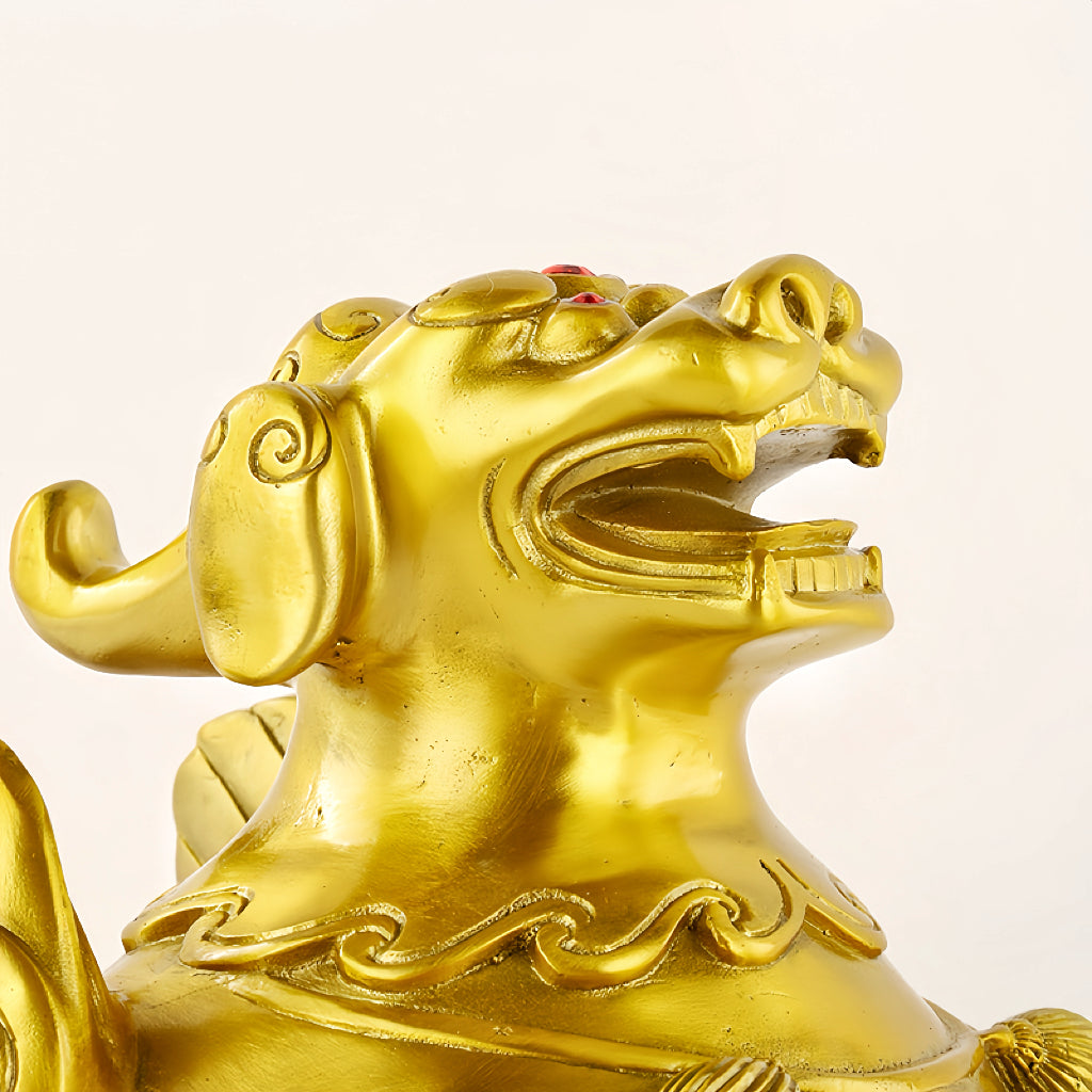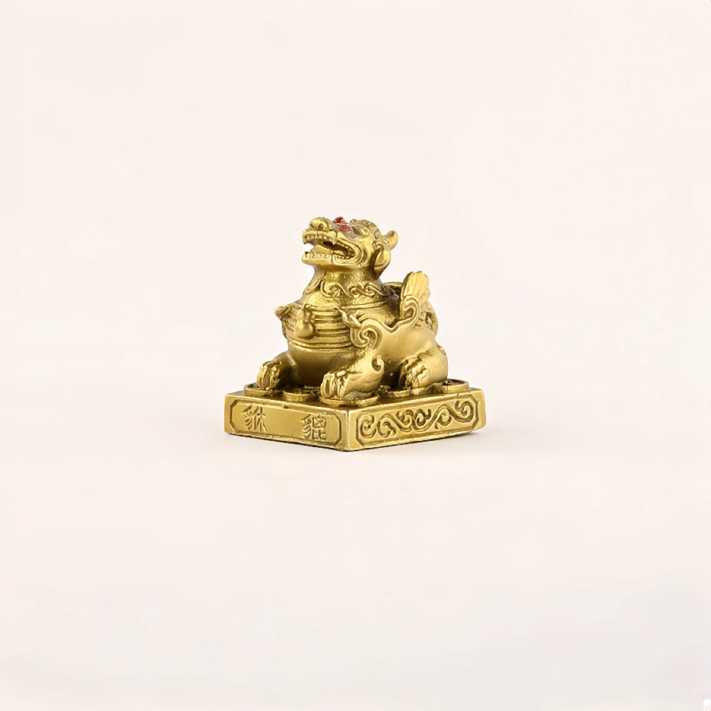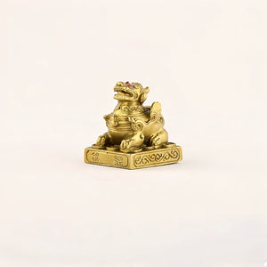 Realizzata in ottone scintillante con dettagli intricati, questa statuetta raffigura il mitico Pixiu, un venerato guardiano celeste nella tradizione cinese, in una posa dinamica: fauci spalancate per divorare la negatività, occhi spalancati per la vigilanza e coda arrotolata che irradia autorità. Decorato con motivi di buon auspicio, il suo collo presenta elaborate decorazioni floreali, mentre le zampe anteriori cullano sfere rotonde con frutti che simboleggiano l'accumulo di ricchezza. Il Pixiu è posto su un piedistallo quadrato inciso con disegni circolari simili a mandala e con i caratteri "招财进宝" (Zhāo Cái Jìn Bǎo - "Attira Ricchezza e Tesori"), con la base bordata di un rosso vibrante per amplificare l'energia ardente e protettiva.
