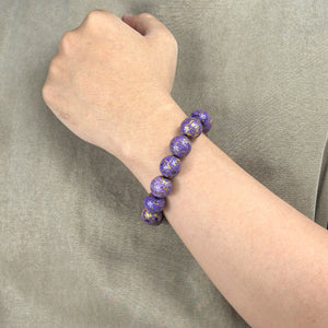 Lasciati conquistare dalla lussuosa artigianalità del nostro bracciale con perle rotonde laccate viola grandi. Realizzato con materiali ecocompatibili come lacca naturale, sandalo viola, lamina d'oro e d'argento e polvere di conchiglia, ogni perla è meticolosamente realizzata a mano con più strati di vernice, dando vita a un gioiello splendido, resistente all'acqua e durevole. Esalta il tuo stile con questo bracciale unico nel suo genere.