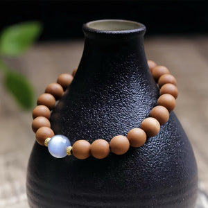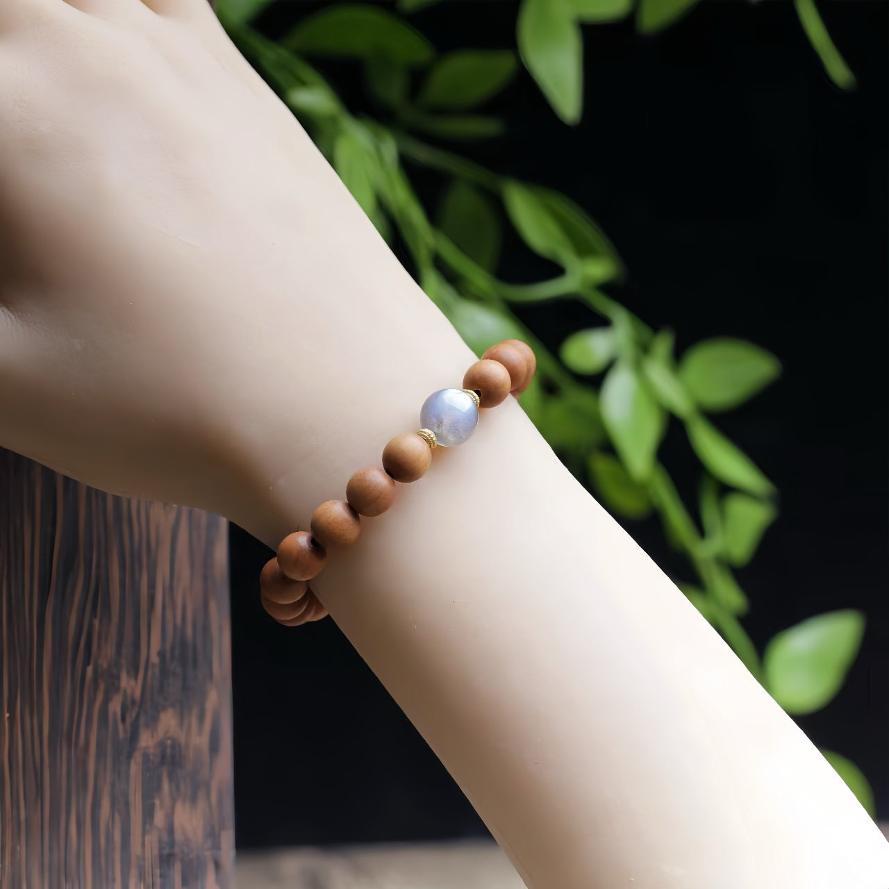 Abbraccia la silenziosa magia della terra e del cielo con il bracciale in pietra di luna grigia e sandalo dell'isola indiana Babi, un'ode minimalista all'energia radicante e all'intuizione celeste.