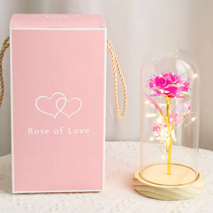 Fai una dichiarazione d'amore audace con la Rosa Eterna in Foglia d'Oro! Racchiusa in una cupola di vetro cristallino e illuminata da lucine LED calde, crea un centrotavola luminoso che cattura i cuori.