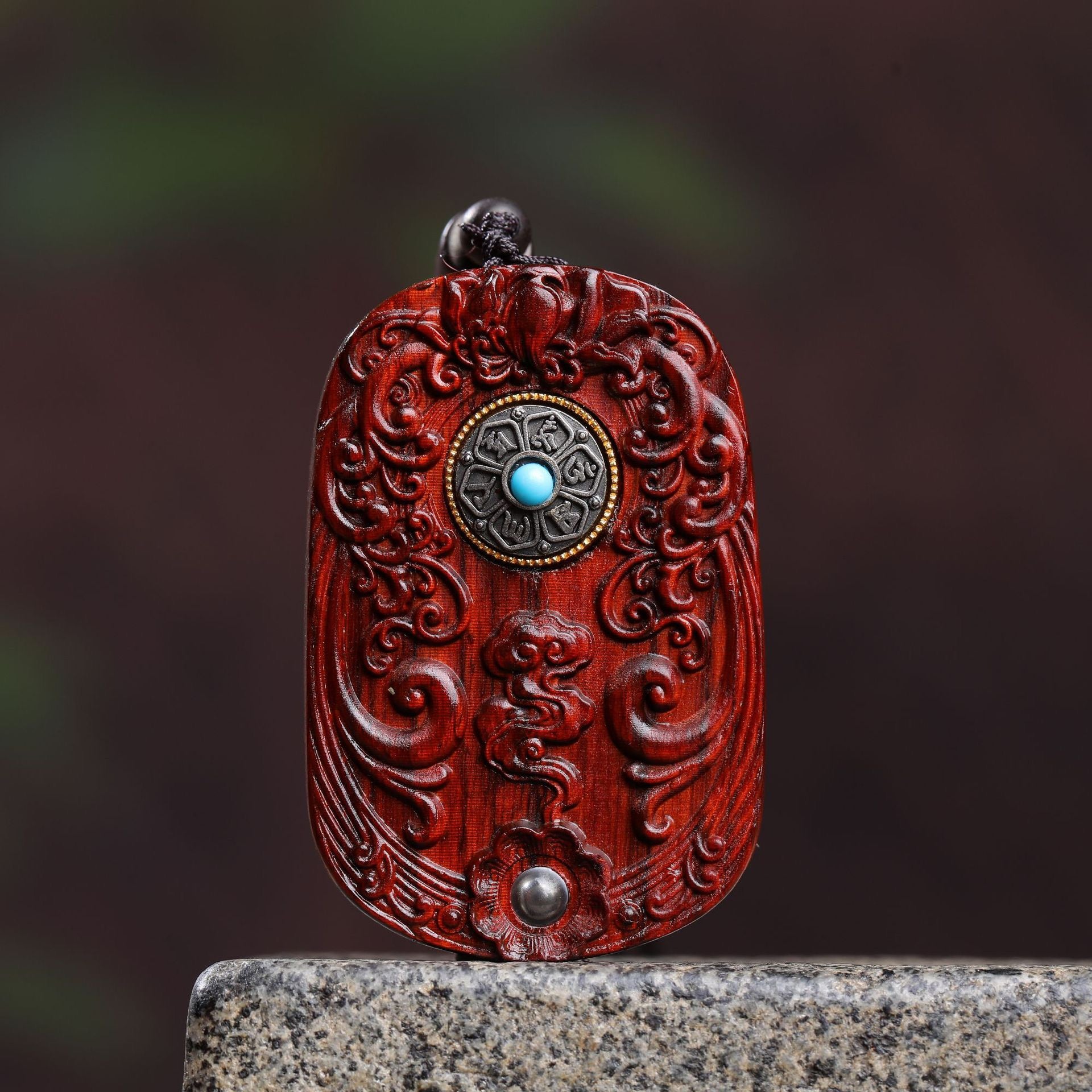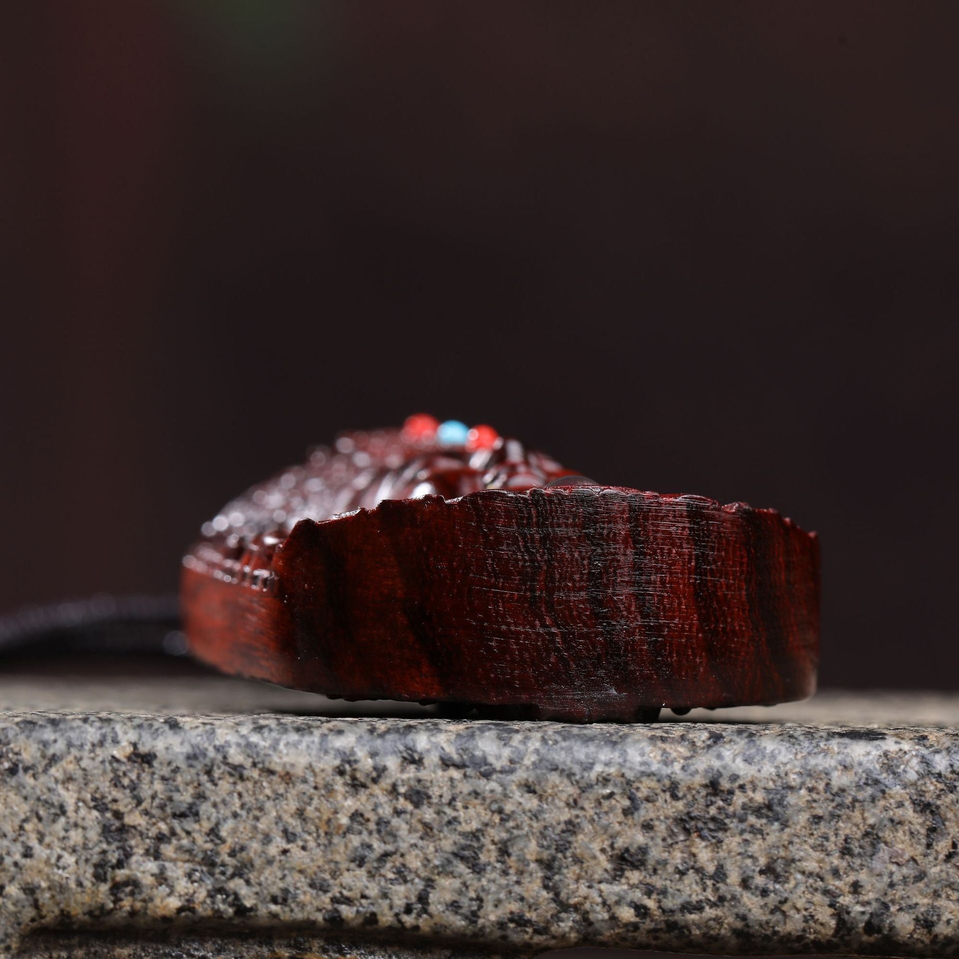 Each pendant is a unique piece of art, showcasing the natural beauty and intricate craftsmanship of the Zitan wood. The inclusion of subtle, colorful accents adds to its unique character, making it a timeless treasure.