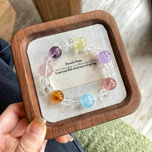 Disposto su un vassoio di legno rivestito di lino con motivi di ispirazione francese, questo braccialetto fonde texture grezze e terrose con il romanticismo parigino: un'ode indossabile al viaggio colorato della vita.