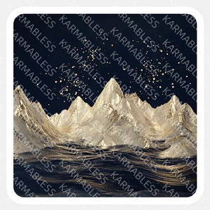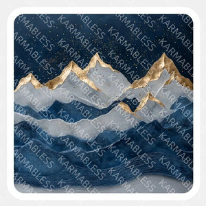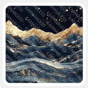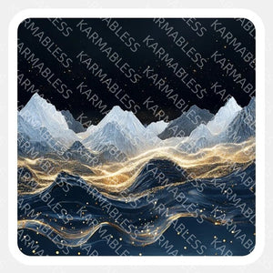 The gentle curves of the mountains shimmer with metallic light, while the tranquil waters beneath reflect the calm beauty of the landscape.