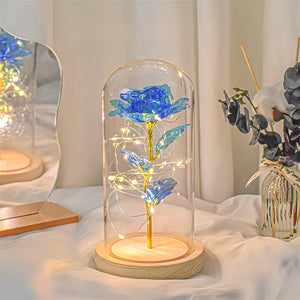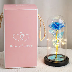 Light up your love with this stunning Blue Gold-Foil Eternal Rose! Encased in a crystal-clear glass dome and resting on a polished wooden base, this rose combines timeless elegance with a modern touch. The intricate gold-foil petals shimmer beautifully in the light, and the embedded LED string lights add a magical, glowing effect.