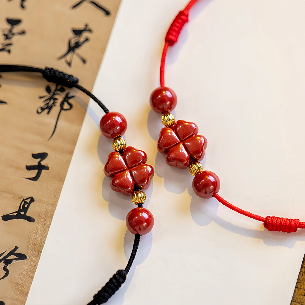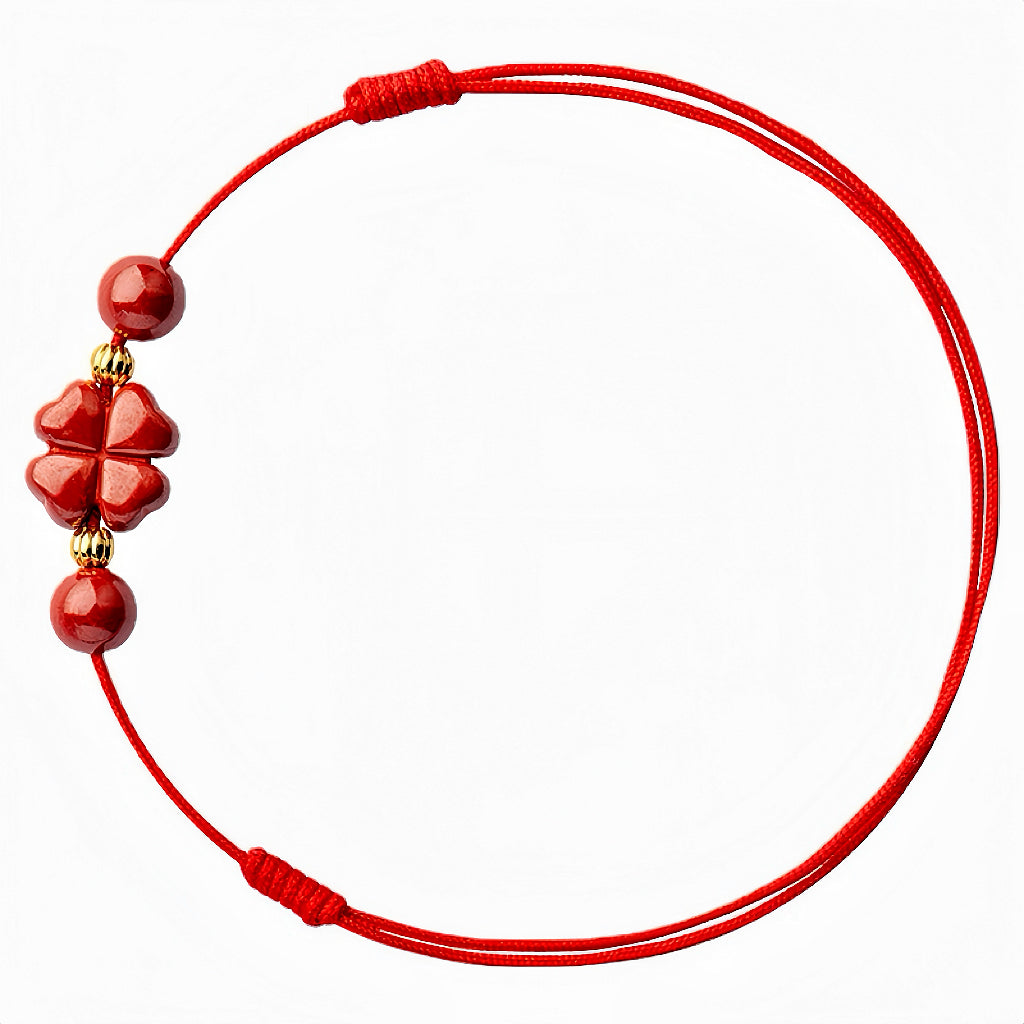 Delicately handcrafted from vibrant crimson thread, it features three smooth cinnabar beads—traditionally cherished in Eastern cultures for their power to attract luck and dispel negativity. At its heart sits a radiant cinnabar four-leaf clover charm, a beloved symbol of fortune across cultures, framed by two gleaming gold-tone accents that amplify positive energy.