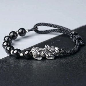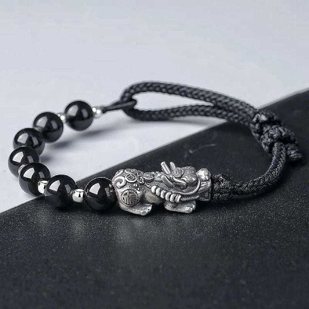 Black Pi Xiu Bracelet: Made from sleek obsidian and adorned with a black rope, it represents strength, grounding, and resilience.