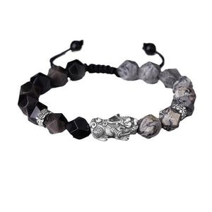 Faceted Obsidian & Map Stone 999 Silver Feng Shui Pixiu Bracelet