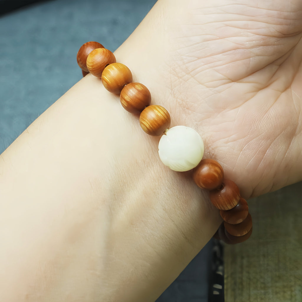 A: Hold the white howlite bead to focus on breathwork or move through each wood bead while reciting an affirmation or mantra.