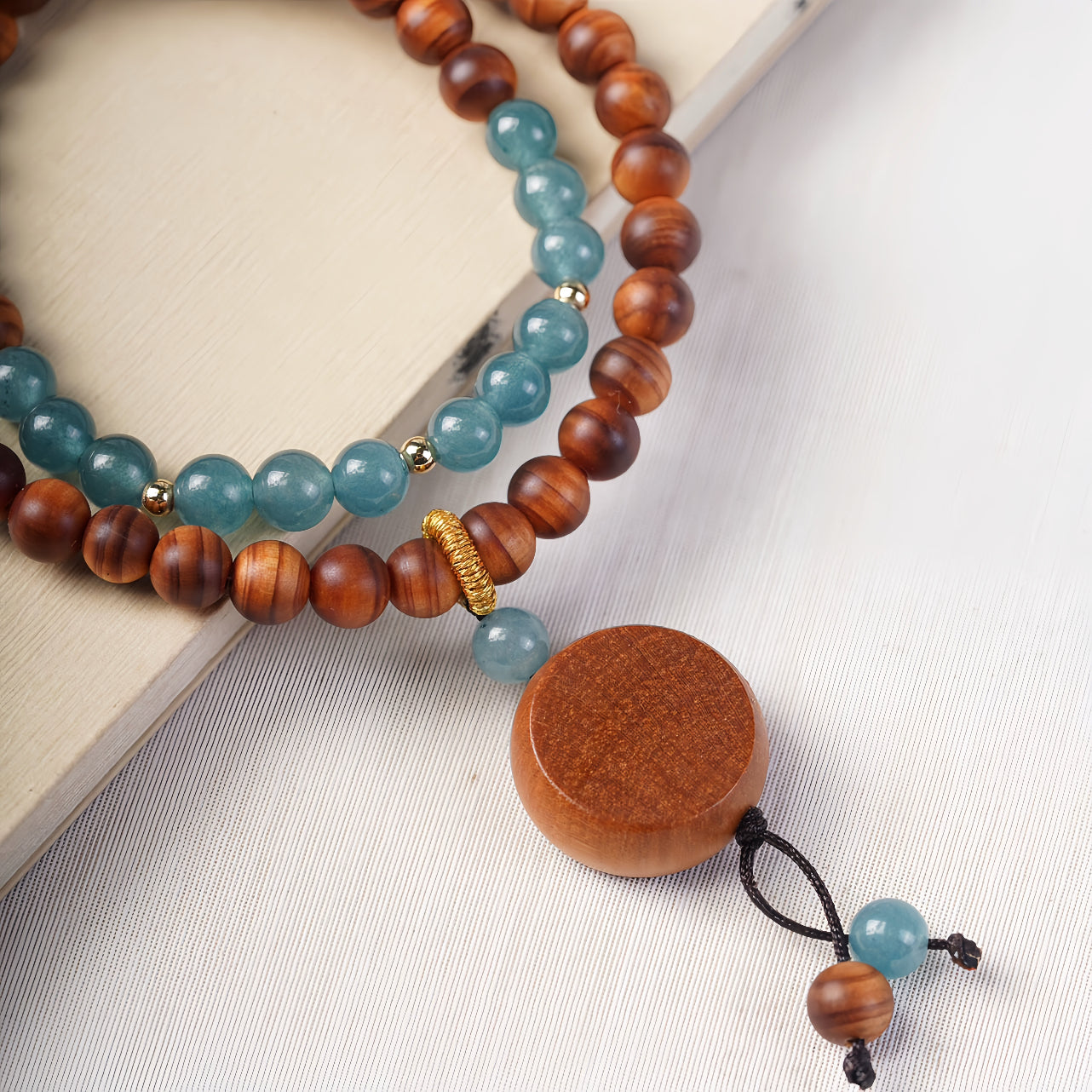 Hand-strung with alternating beads of aromatic cliff cypress wood (deep brown, prized for its purifying energy and earthy warmth) and serene blue-green jade stones (symbolizing balance and inner peace), this mala bracelet is crafted for meditation, prayer, or daily grounding rituals.