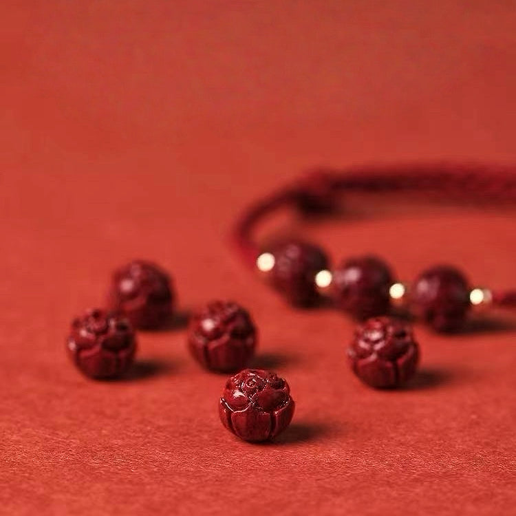 Central to its design is an intricately carved deep red lotus bead—a sacred symbol of purity and spiritual growth in Eastern traditions.