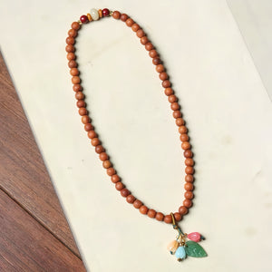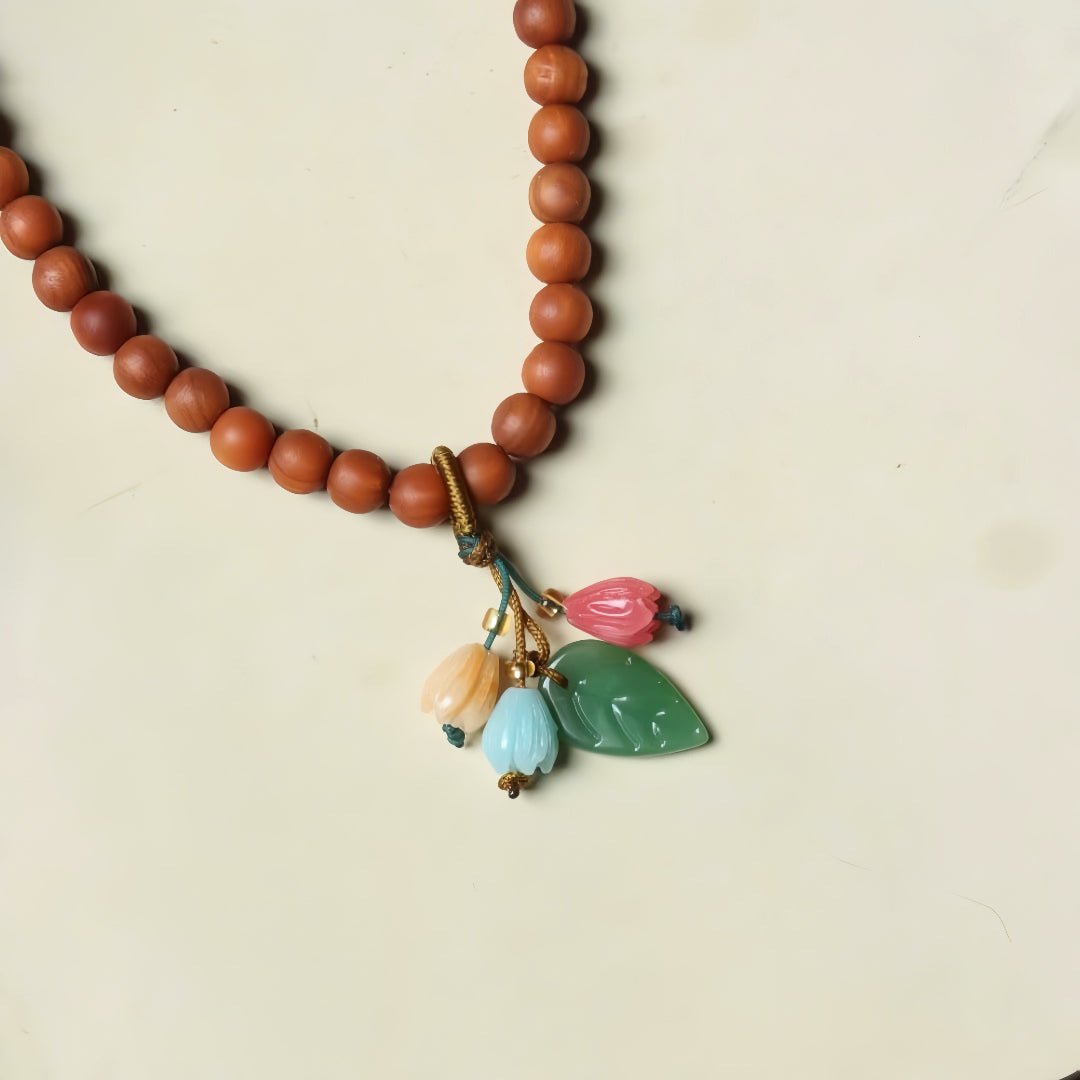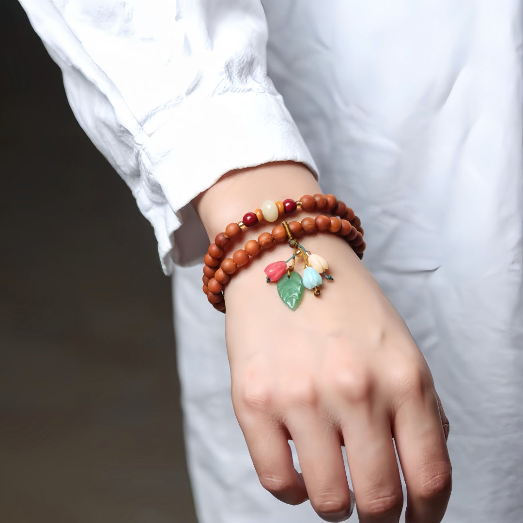 The upper strand features warm, polished cliff cypress wood beads—revered for their purifying energy and subtle woody aroma—while the lower strand mirrors this simplicity with added floral charm. Adorned with dainty pink jade blossoms (symbolizing self-love and renewal), green leaf charms (representing growth), and blue-white jade drops (evoking clarity and calm), this bracelet balances organic textures with refined symbolism.
