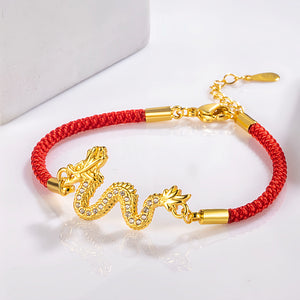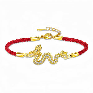 The dragon coils mid-motion, embodying the Yang energy of ambition, transformation, and cosmic command revered in Lunar New Year traditions. Adjustable gold chain links and a secure lobster clasp ensure effortless wear, while crimson-and-gold threads weave resilience into every strand.