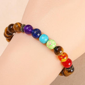 This bracelet features a harmonious blend of Yellow Tiger's Eye stones and the powerful seven chakra beads. The Yellow Tiger's Eye beads, surrounding the chakra stones, provide a protective and grounding force. Revered as the "Stone of Courage and Confidence," Tiger's Eye is known to balance and strengthen the mind, fostering clarity, focus, and determination. Its grounding energy shields the wearer from negativity, helping to create a stable foundation for personal growth and transformation.