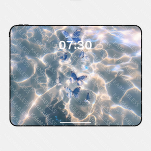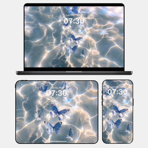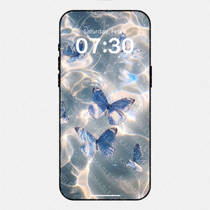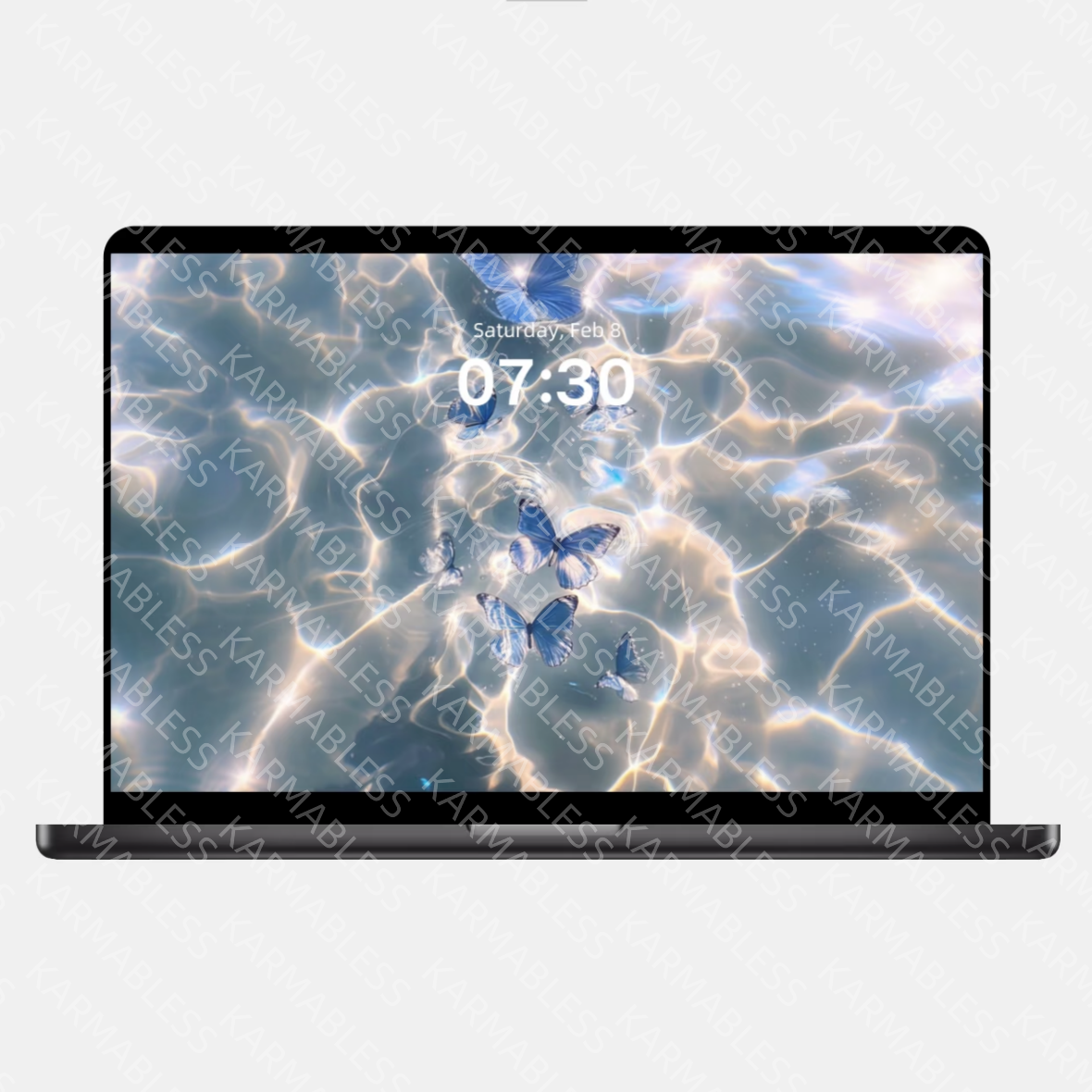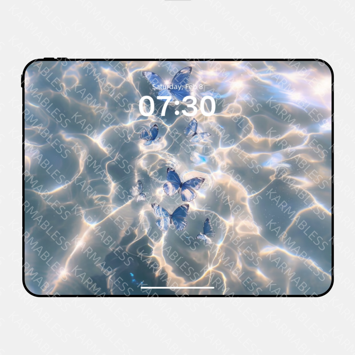 Borboletas azuis suaves dançam sobre águas ondulantes, refletindo suaves raios de luz como sussurros de tranquilidade.