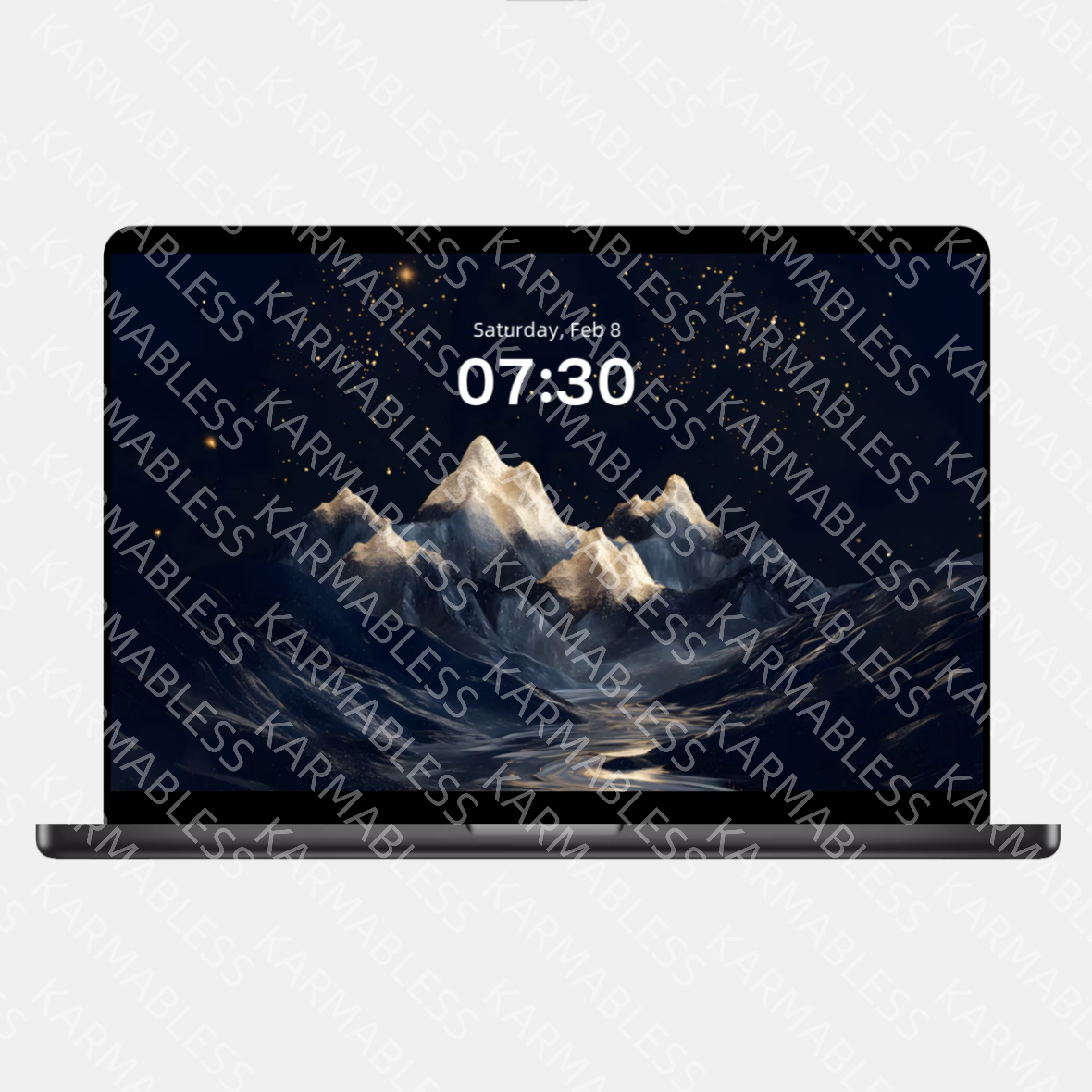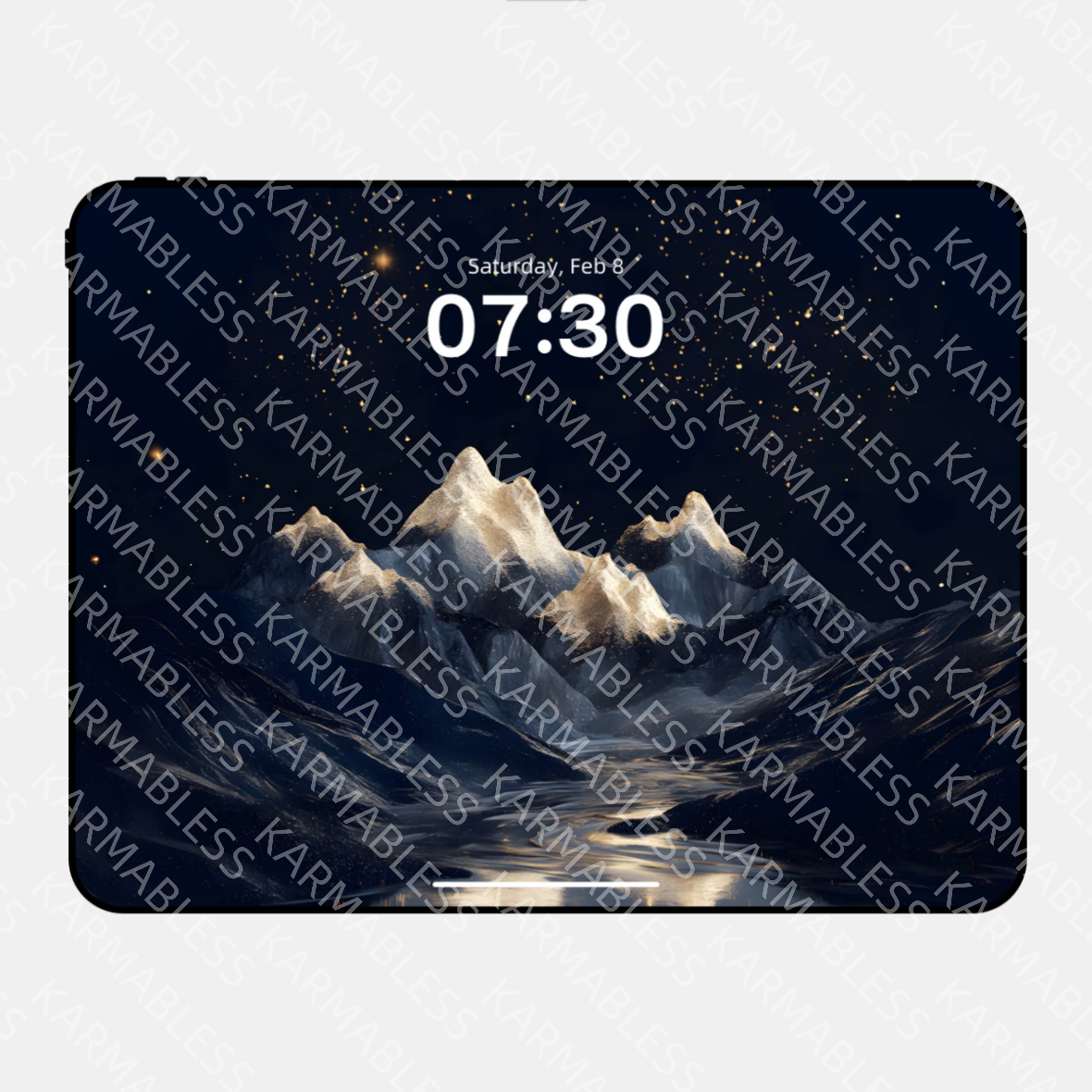 Mergulhe a sua tela em serenidade com esta paisagem poética — montanhas com pontas douradas erguem-se sob um céu estrelado, espelhadas por um lago tranquilo, lá em baixo.