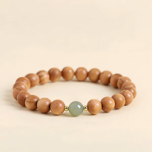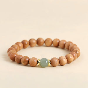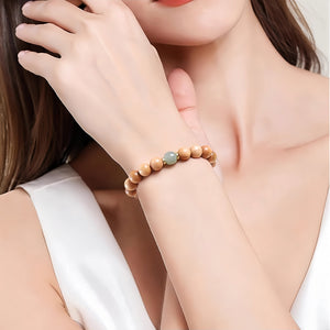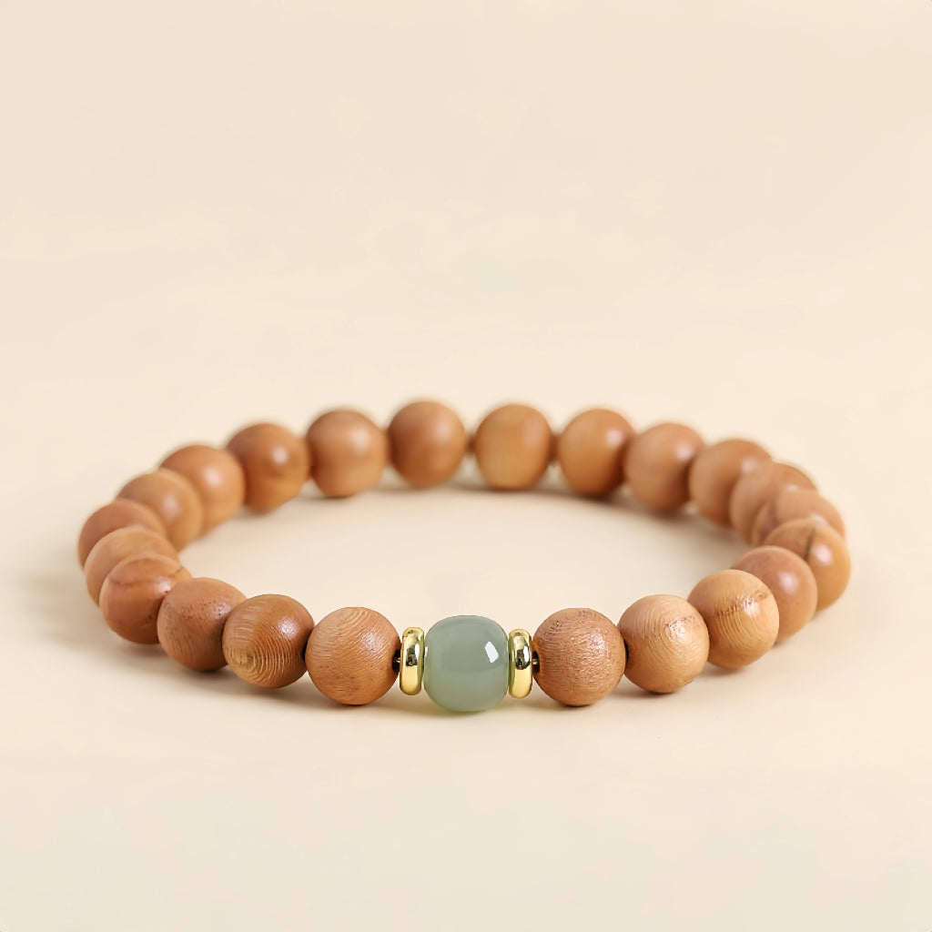 Contas suaves de madeira de pessegueiro, quentes e ligeiramente texturadas, evocam energia de ligação à terra e uma ligação com o mundo natural. No centro, repousa uma serena pedra de jade, cujo tom verde suave simboliza harmonia, renovação e sabedoria ancestral, ladeada por brilhantes detalhes dourados que acrescentam um toque de sofisticação moderna.