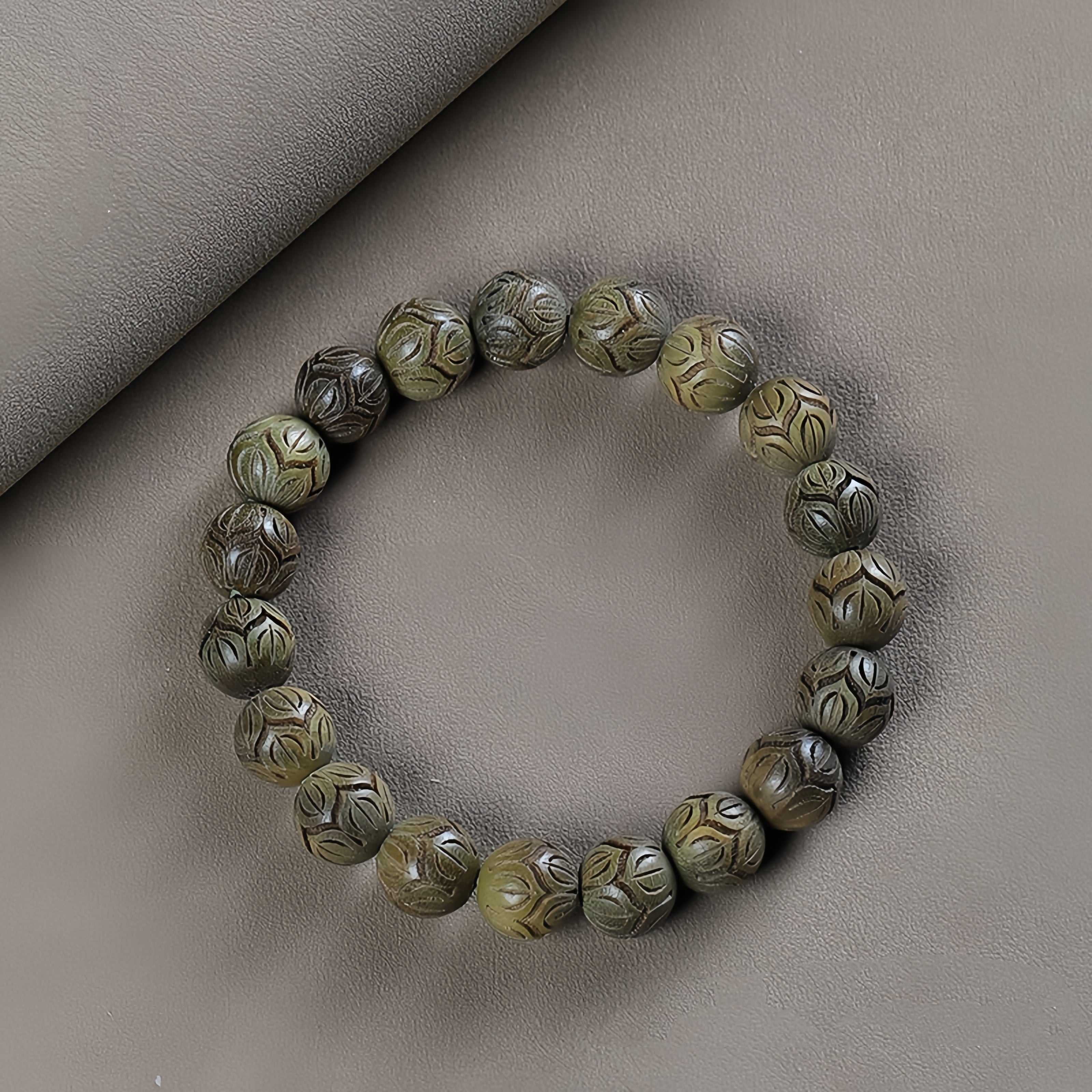 Cada conta de sândalo é esculpida com mandalas de lótus que se aprofundam em definição com o envelhecimento da madeira. Os sulcos proporcionam uma microacupressão durante a meditação com os polegares, enquanto a madeira em tom jade liberta uma fragrância fresca e verde para uma redefinição mental. Utilize-a durante bloqueios criativos ou momentos de desintoxicação tecnológica – um lembrete prático de que o crescimento requer foco e libertação.