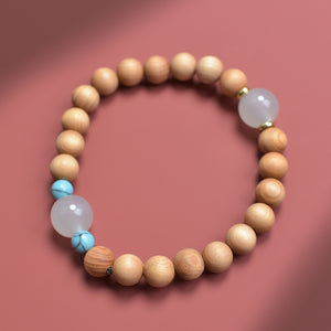 Apresenta contas de madeira de cipreste ligeiramente tratadas com água salgada natural transportada pela lua. Ao utilizá-lo, a madeira liberta gradualmente um aroma suave e relaxante que faz lembrar gotas de orvalho da floresta. O acabamento mate brilha subtilmente com pouca luz, criando um ritual noturno sereno. Combine com a meditação noturna ou coloque-o na mesa de cabeceira para uma noite de sono tranquila.