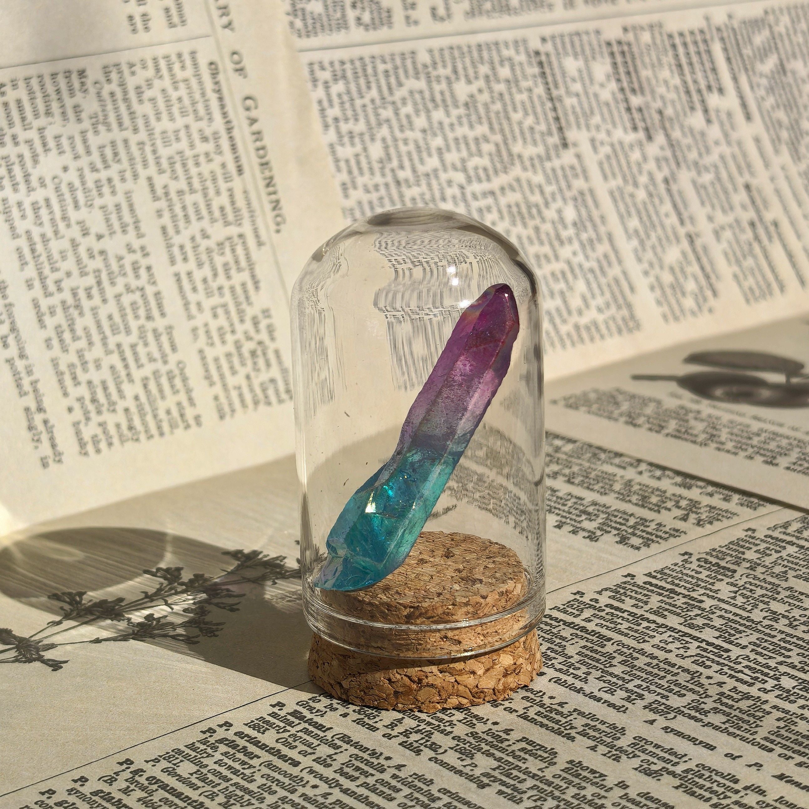 Este requintado conjunto para colecionadores apresenta uma seleção criteriosamente selecionada de cristais naturais e espécimes minerais. Cada peça é exibida sob uma cúpula de vidro transparente, assentando elegantemente sobre uma base de cortiça, tornando-a perfeita para exposição ou estudo. O conjunto inclui sete deslumbrantes variedades de cristais, cada uma com características únicas e cores vibrantes: