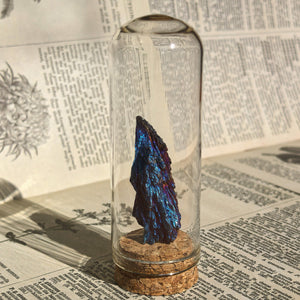 Cristal de pena azul galvanizado : um exemplar azul brilhante com uma estrutura complexa semelhante a uma pena.