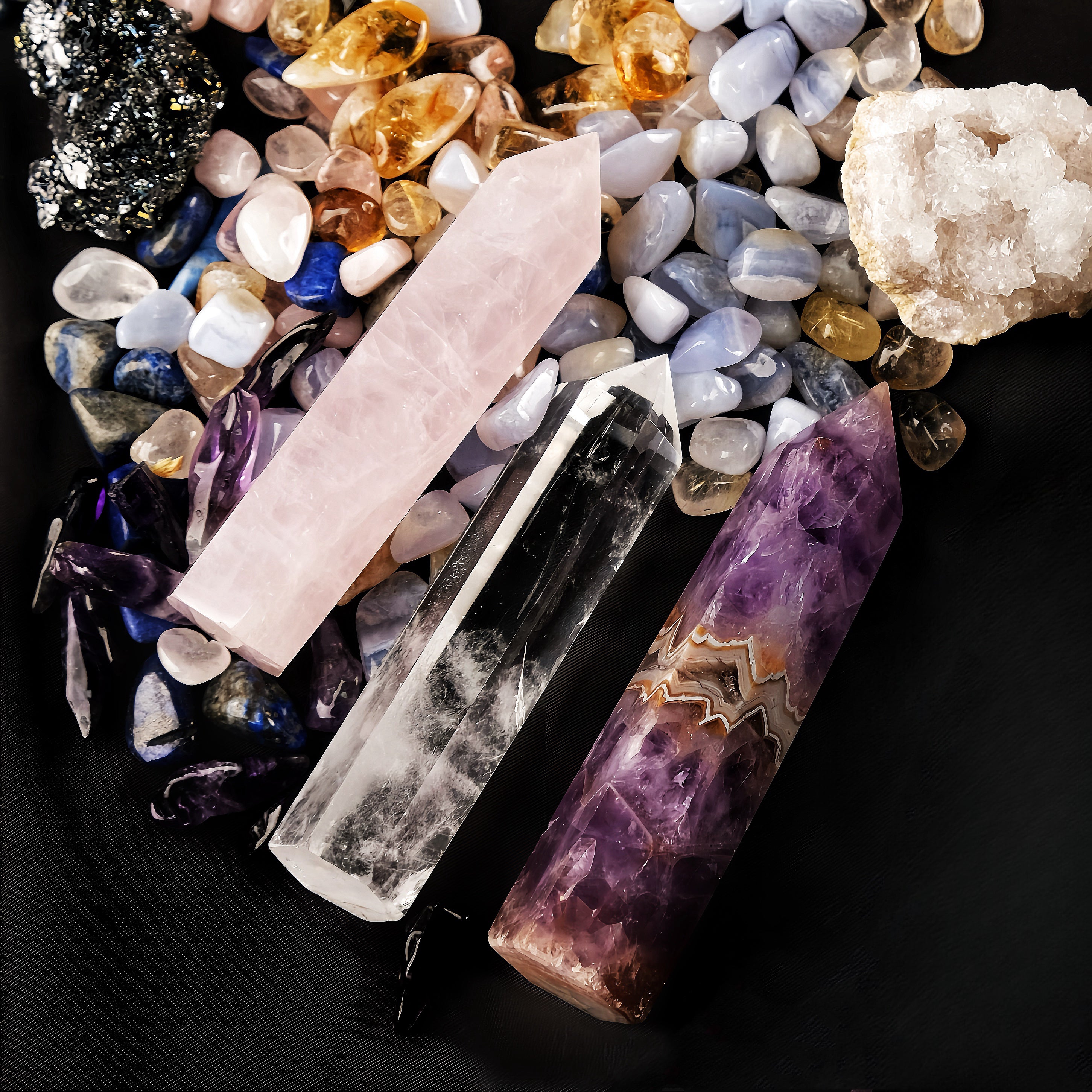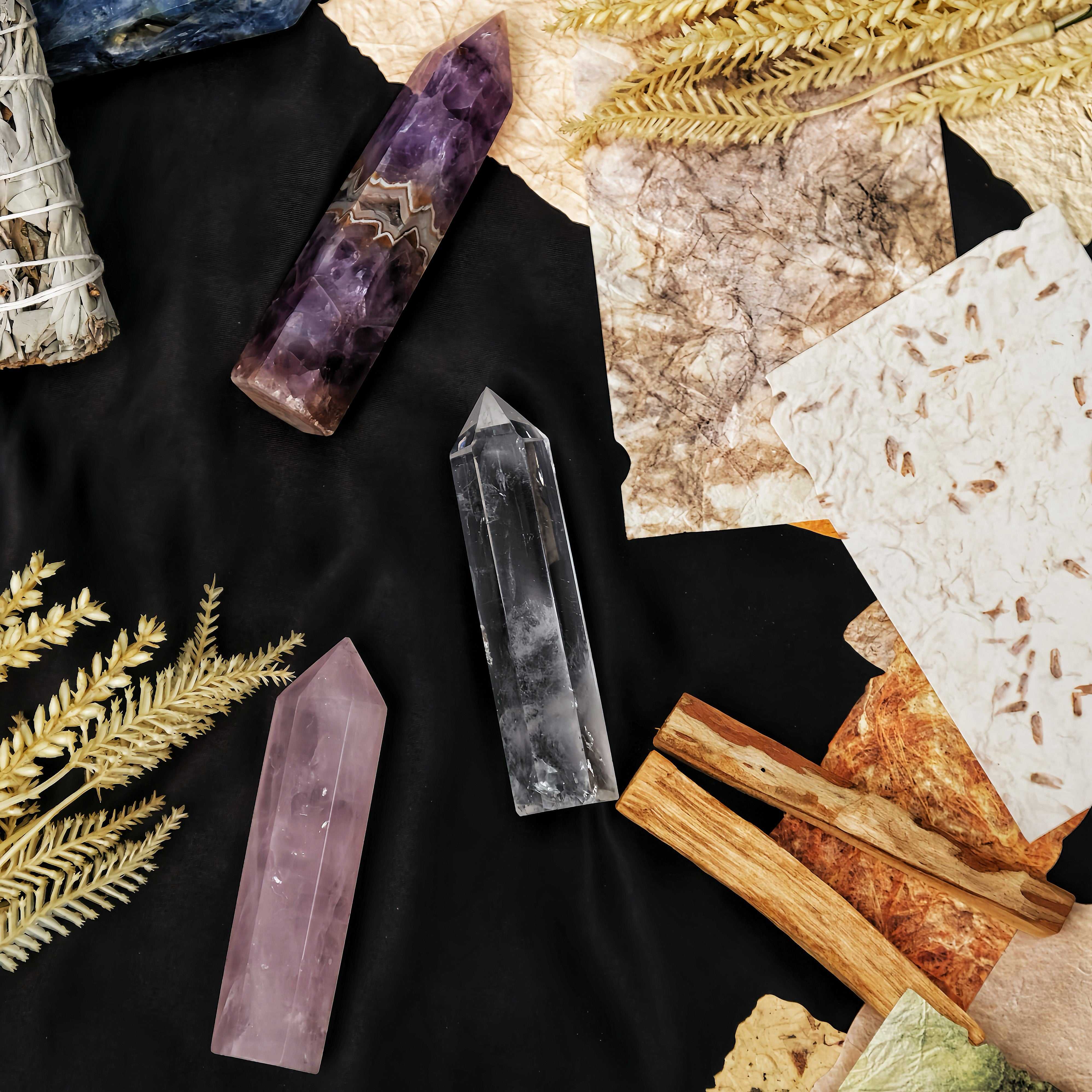 Entre num reino de energia e transformação ilimitadas com o Conjunto Torre de Cristal Natural, uma coleção selecionada das pedras mais encantadoras da natureza.