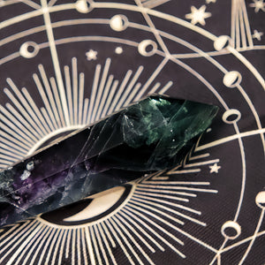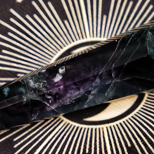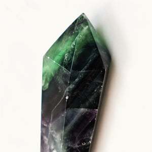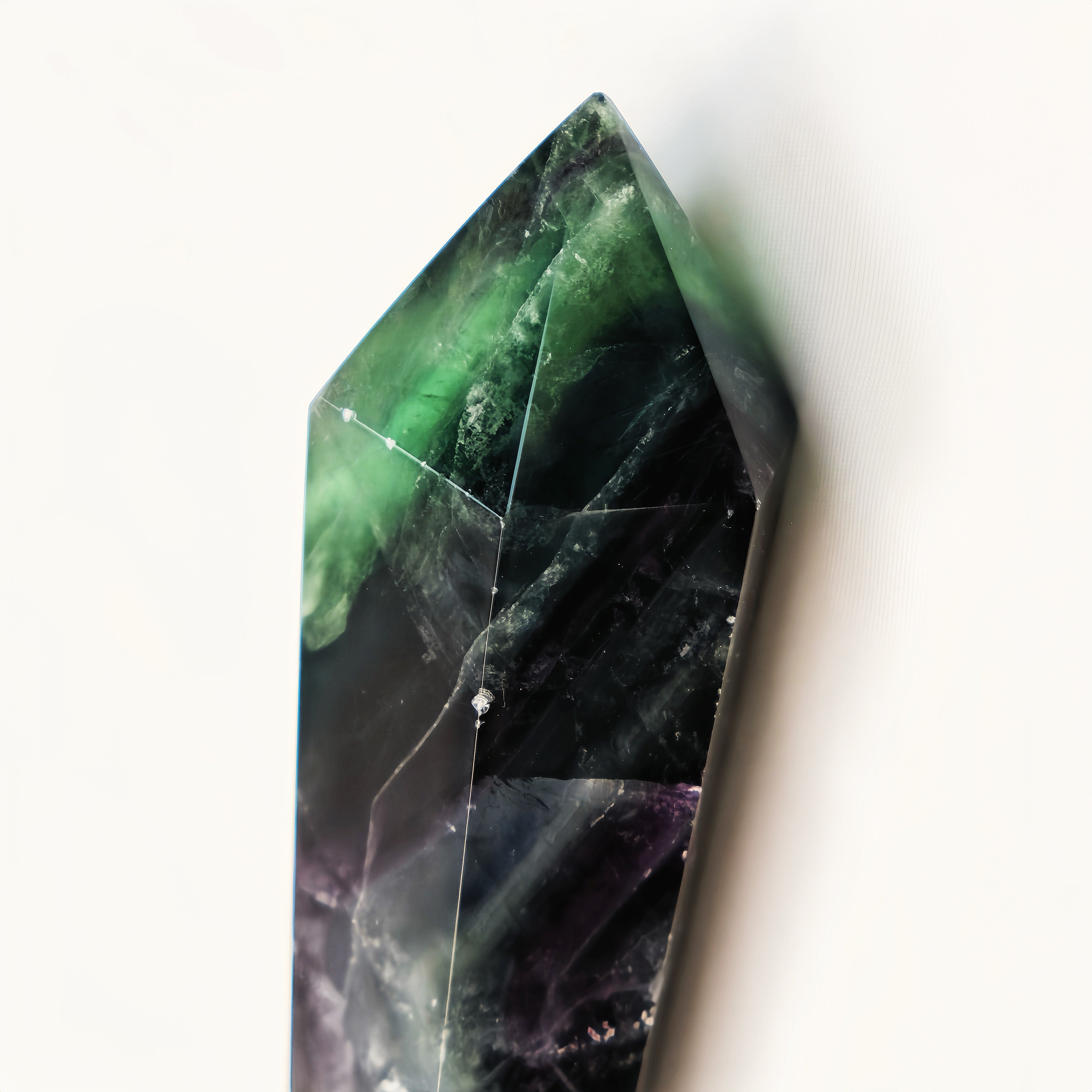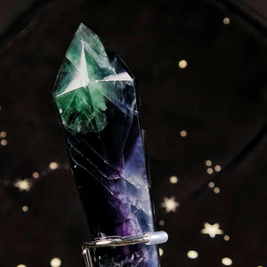 Banhada em faixas vibrantes de verde, roxo e azul, a Varinha de Fluorite Arco-Íris é um farol de clareza e perceção espiritual.
