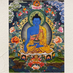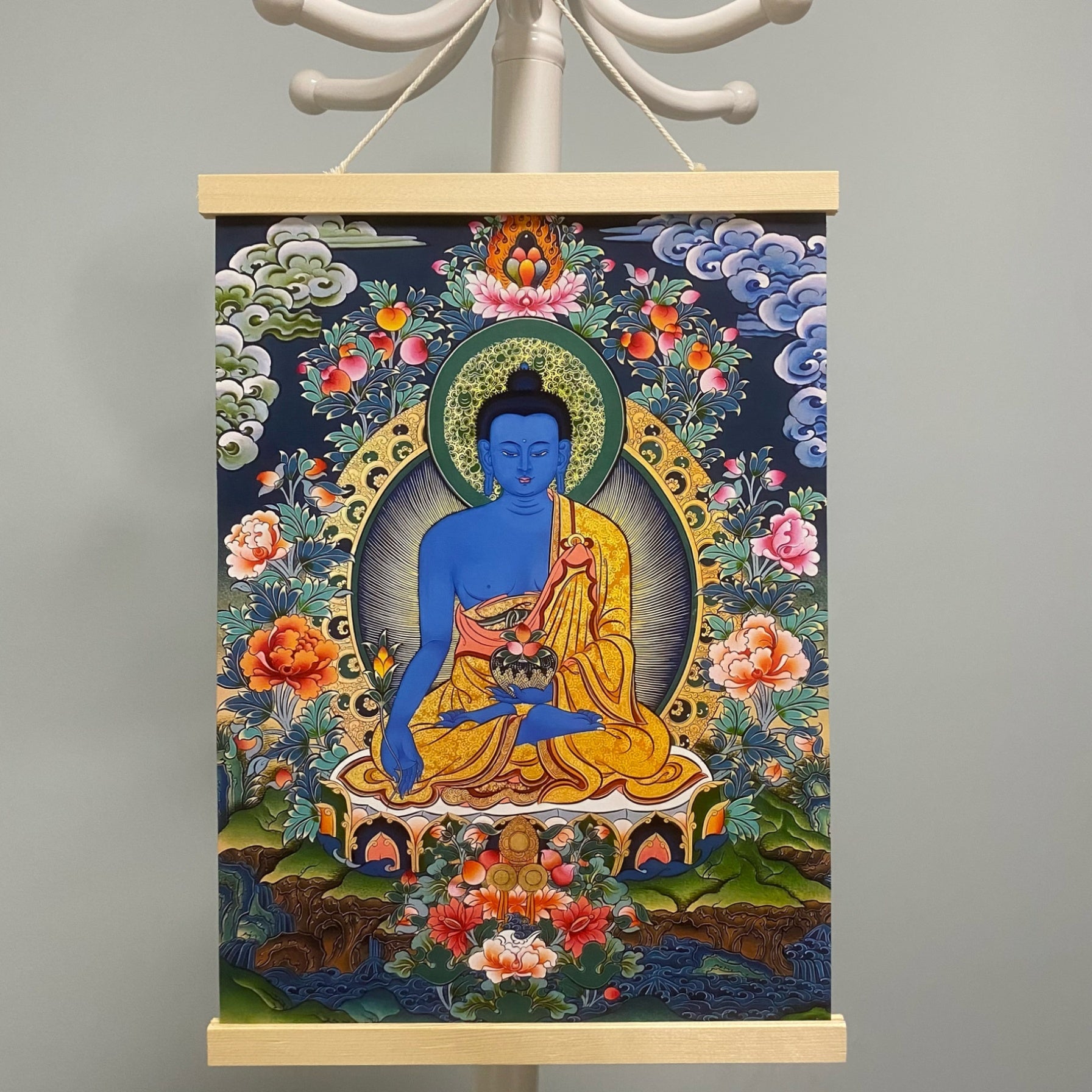 The Medicine Buddha (Bhaisajyaguru) is the embodiment of healing. His radiant, deep blue form is the color of lapis lazuli, a stone long associated with healing power. He holds a bowl of medicinal nectar, symbolizing his power to cure all suffering, both physical and mental. Displaying his image is believed to eradicate sickness, promote health and longevity, and help overcome the inner poisons of attachment, hatred, and ignorance. He is a perfect guardian for health and well-being.