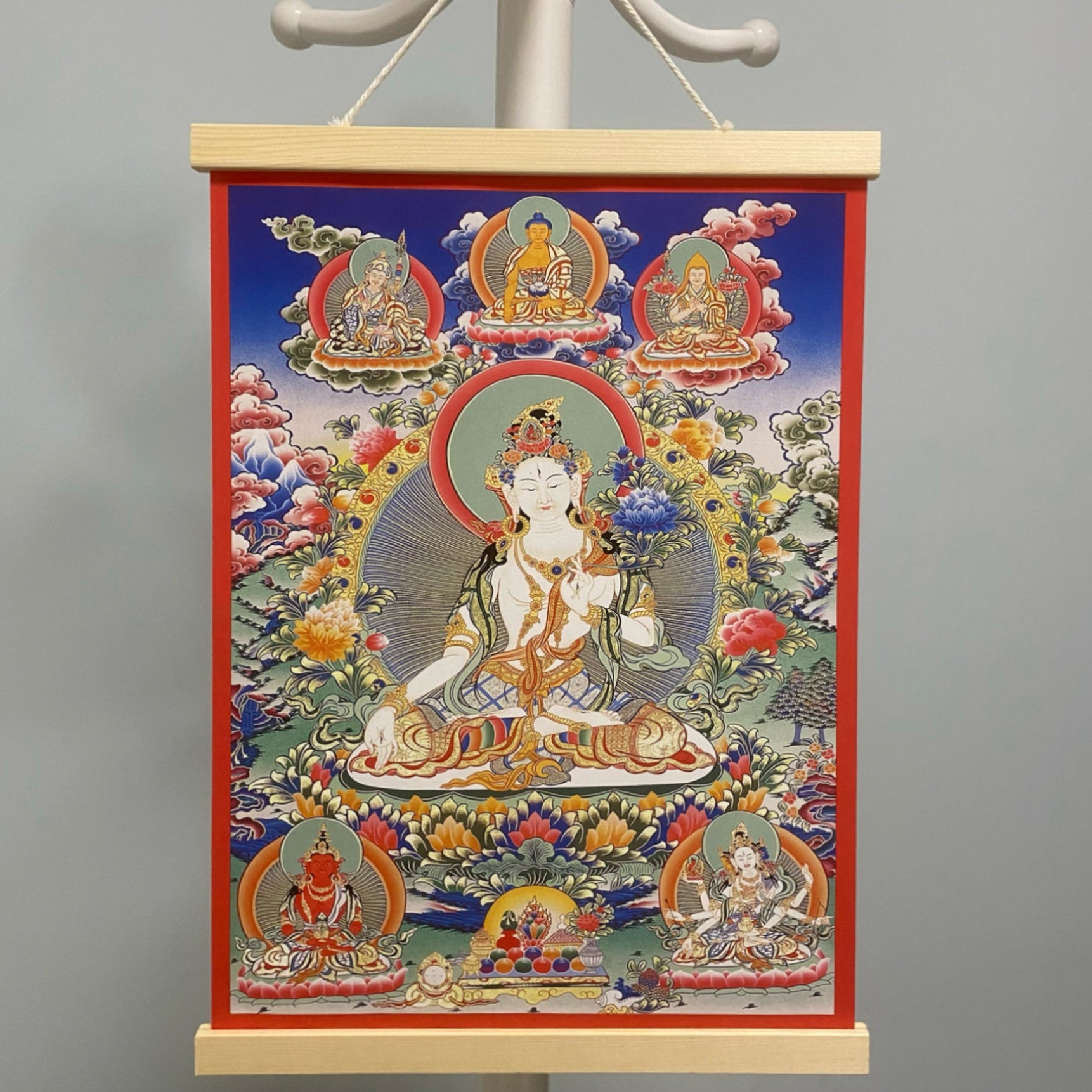 Bring a touch of timeless spiritual beauty and serene energy into your home with this exquisite Buddhist deity wall scroll. Designed to be a source of peace and inspiration, this piece blends the profound symbolism of traditional Tibetan art with an elegant, modern presentation, making it a perfect addition to any sanctuary.