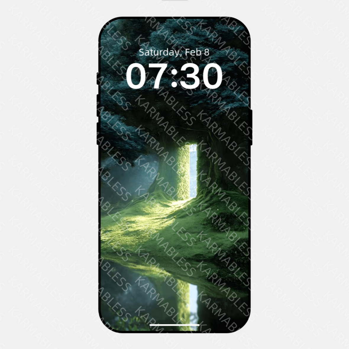 Um portal brilhante aninhado numa árvore imponente convida-o a um mundo de tranquilidade, enquanto o reflexo suave na água serena, lá em baixo, sussurra paz.