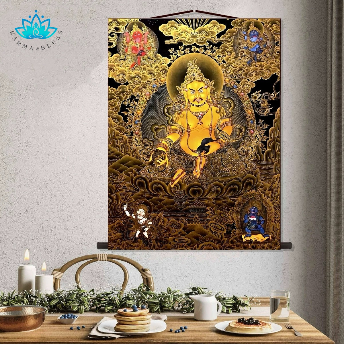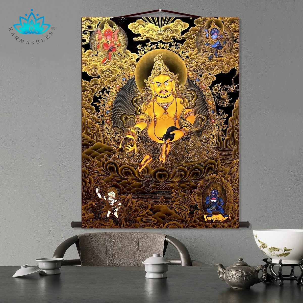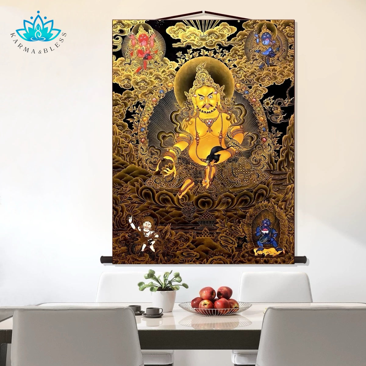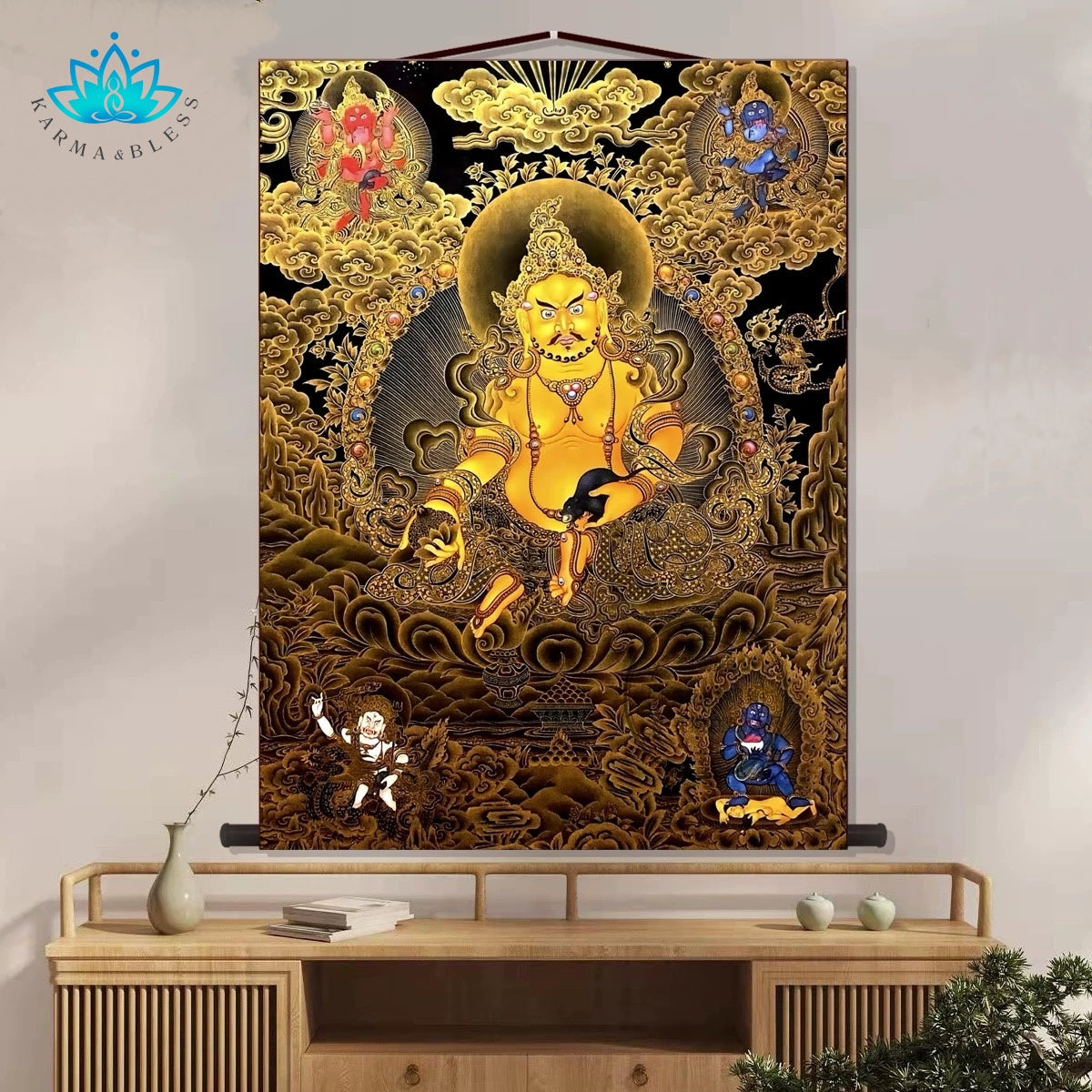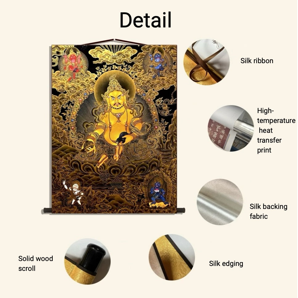 Transform your space and invite the golden light of prosperity with this stunning decorative wall scroll. Featuring the powerful and benevolent image of Yellow Jambhala (黄财神), this beautiful piece of spiritual art is designed to bring auspicious energy and a touch of sacred elegance to any modern home or office.